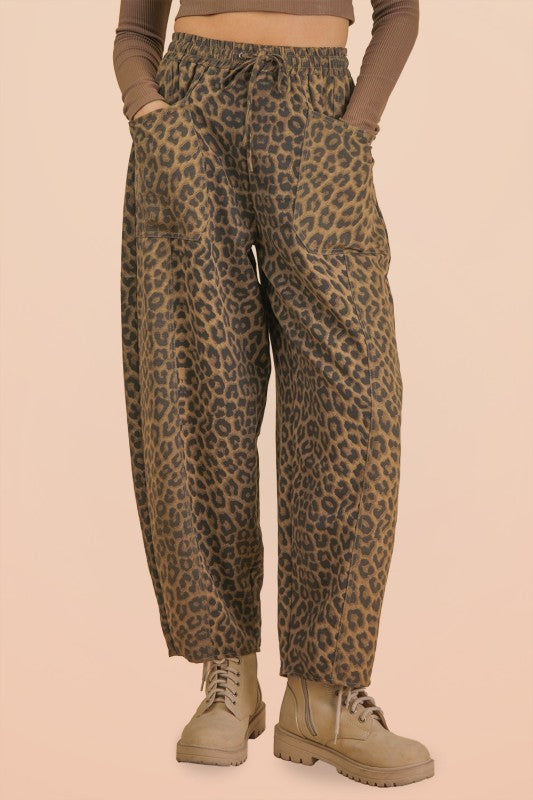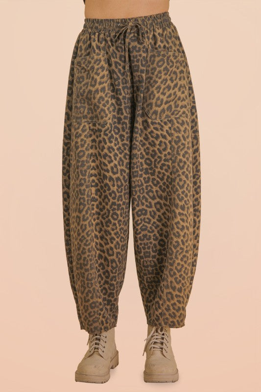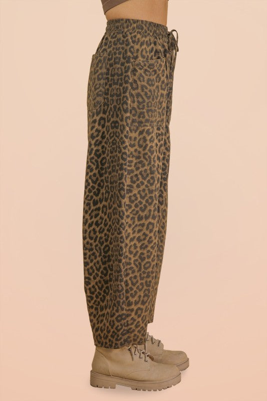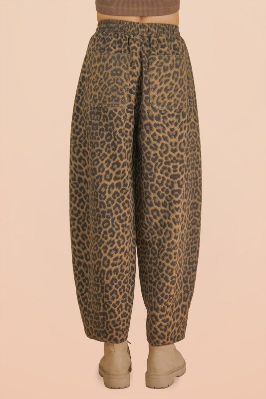 Mocha leopard print elastic waistband barrel pants with front & back pockets