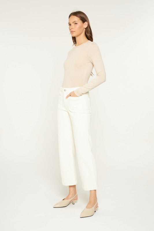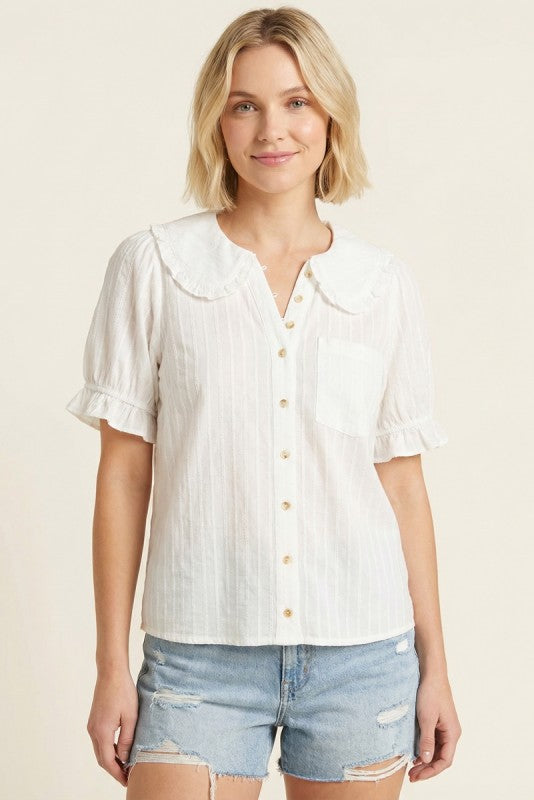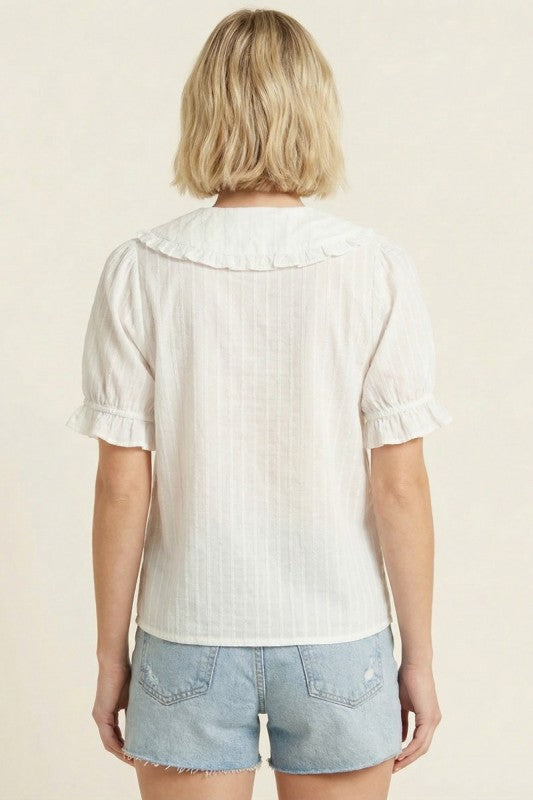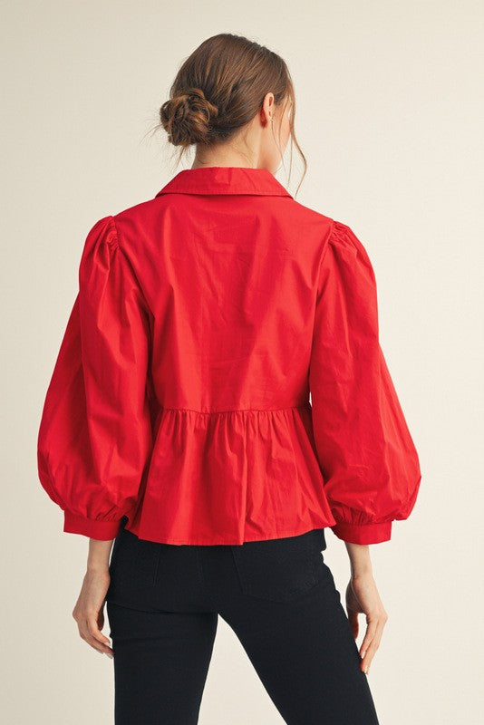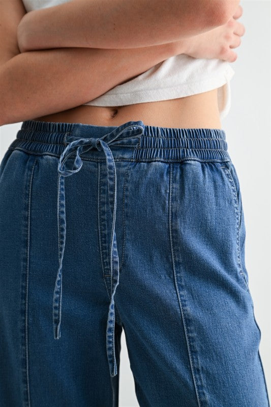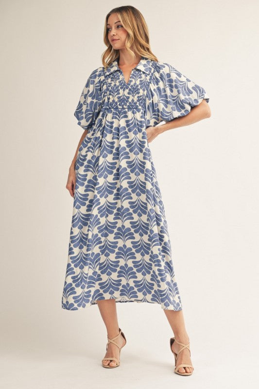 Denim blue short puff sleeve midi dress with a collared V neckline, smocking detail on the front, and side pockets