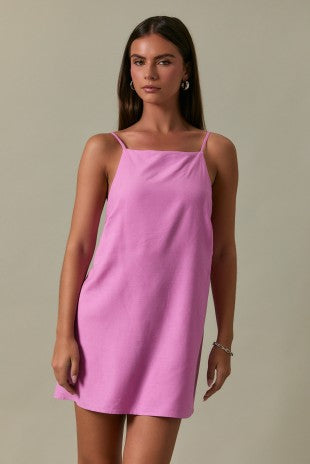Regular price $ 48.00Pink square neck, spaghetti strap romper with adjustable straps and an open back with tie detail, shorts have back zip close