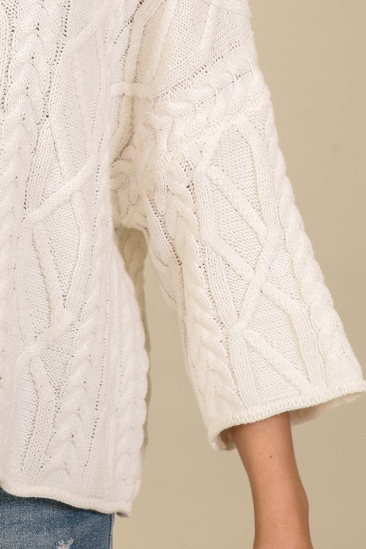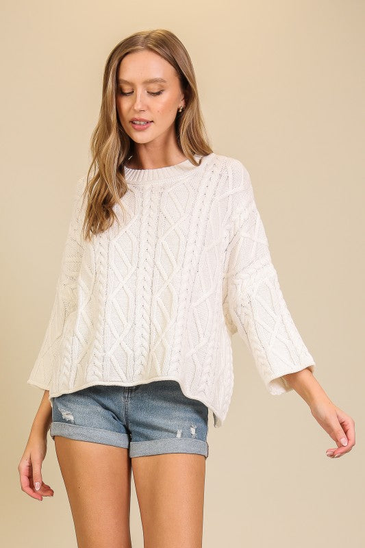 Lavender striped pullover with contrast band around the neck, sleeve and bottom
