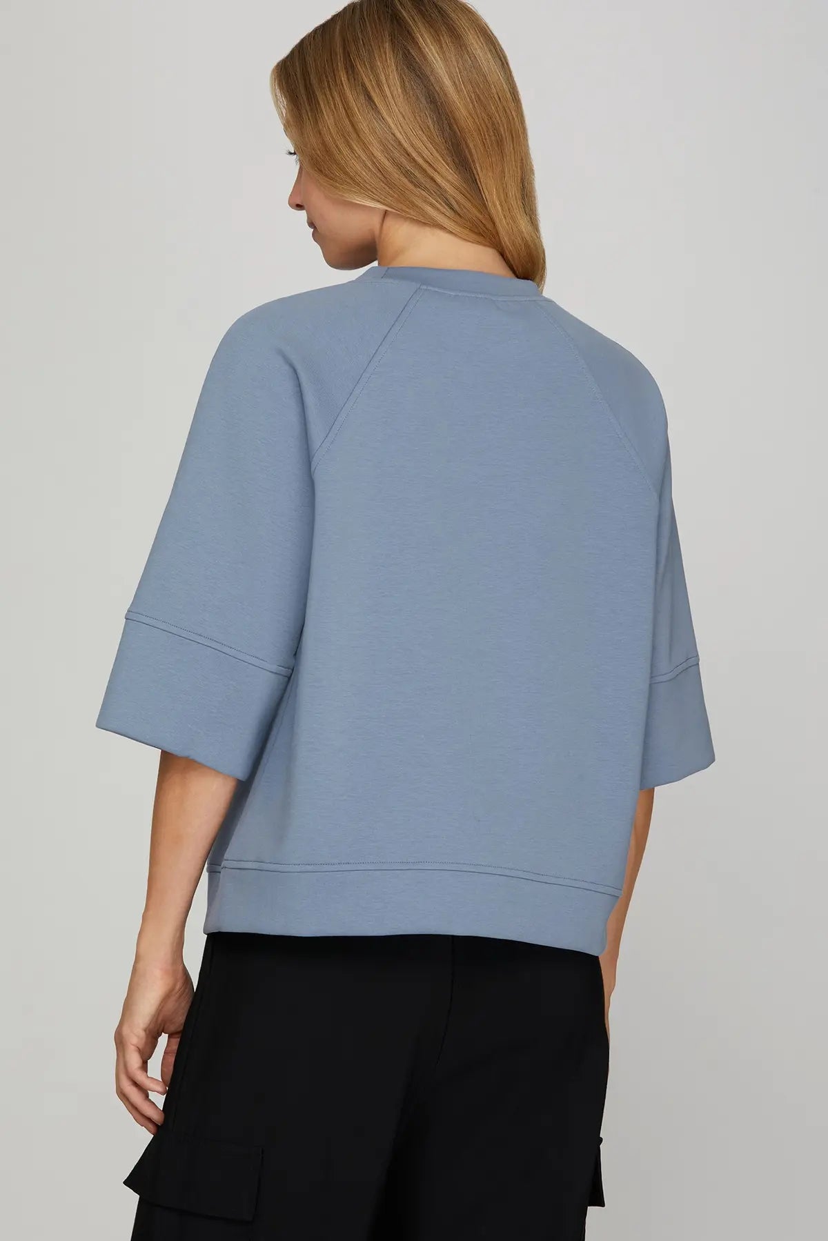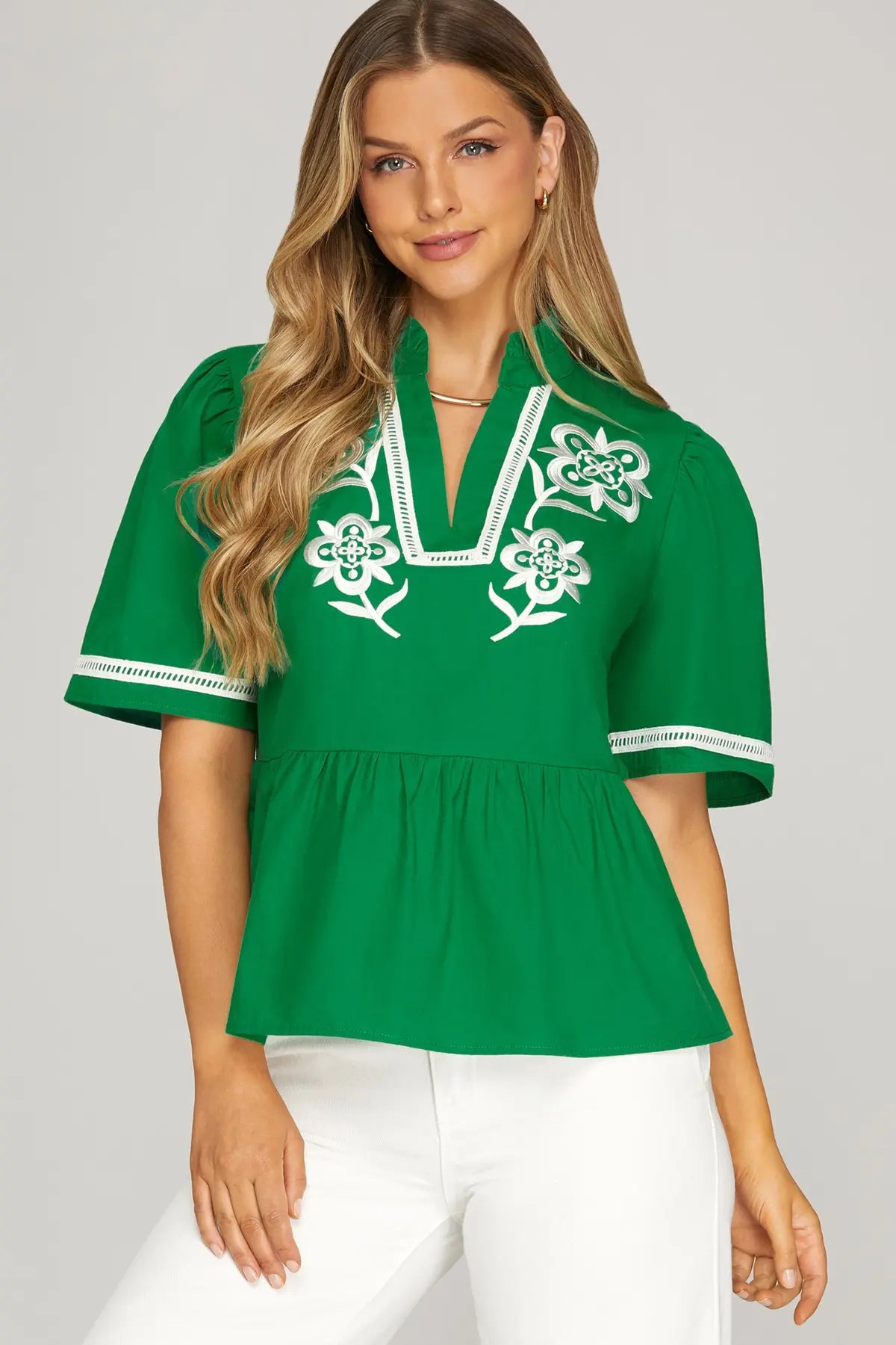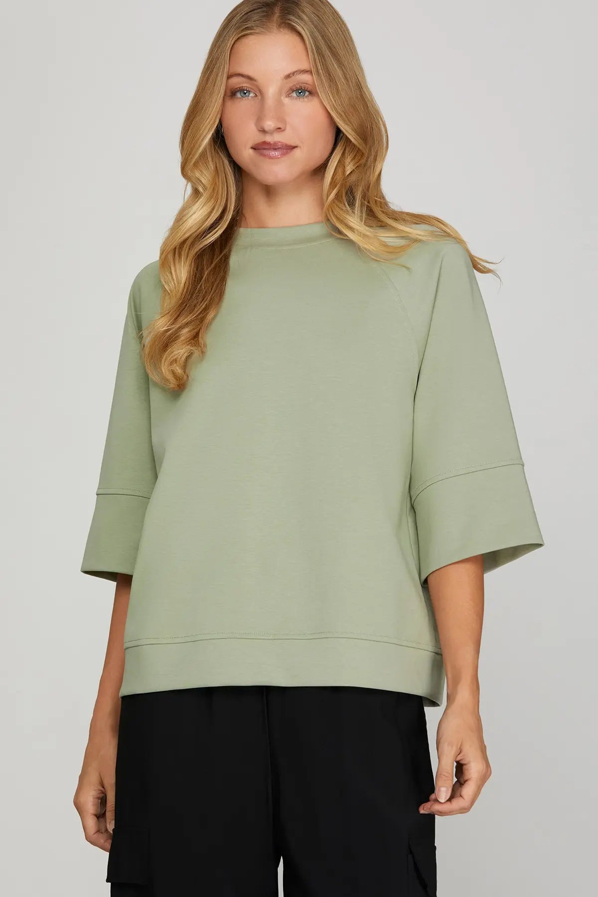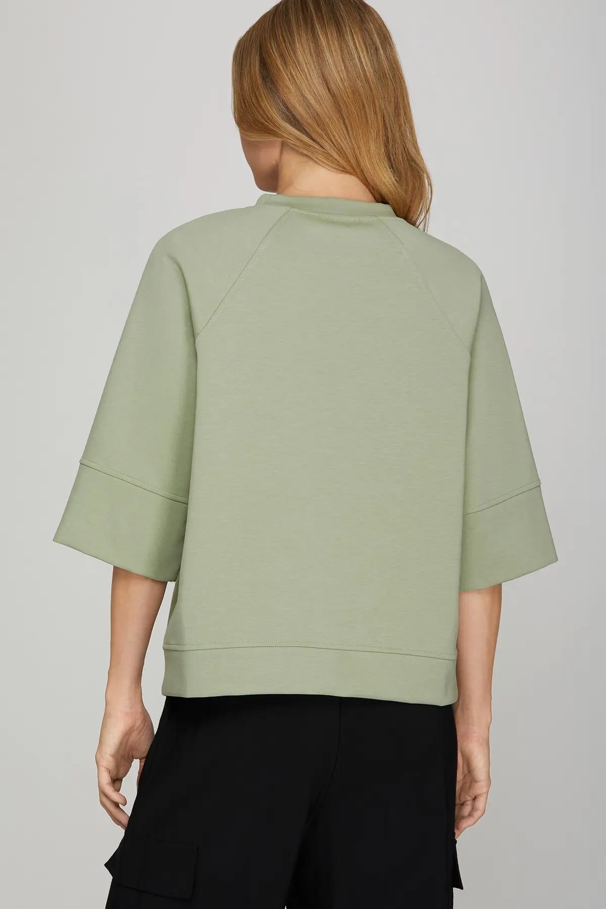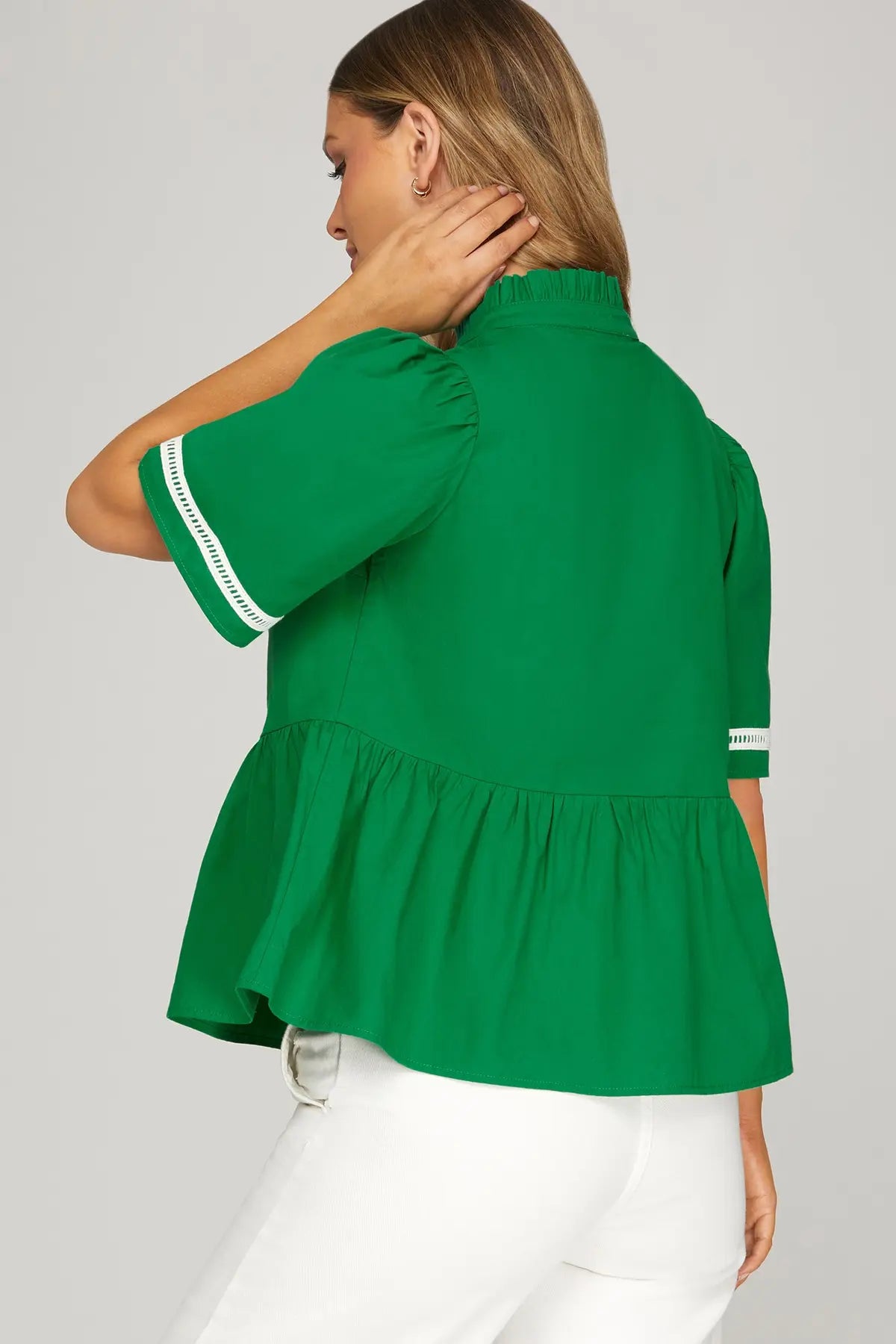 Sage print 3/4 sleeve button down blouse with a ruffle hem