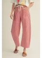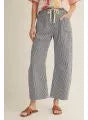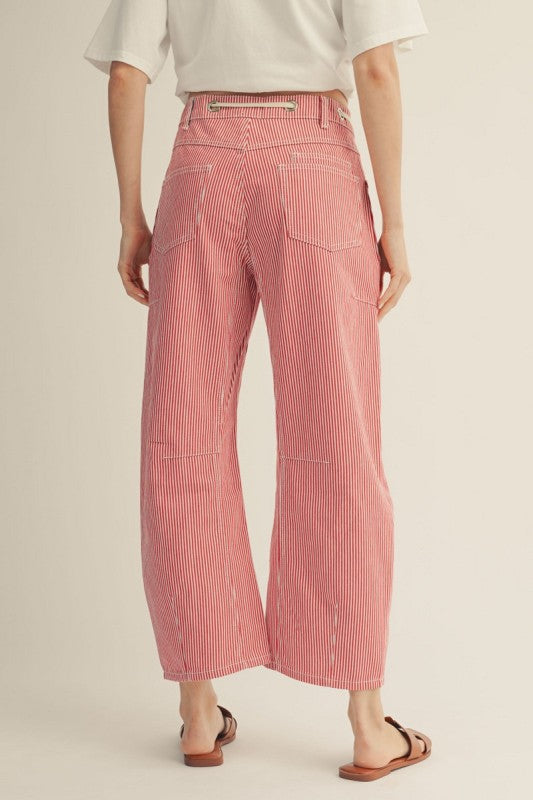 Drawstring waist, stripe barrel jeans. Adding a little print to your outfit with the cutest, striped barrel leg jeans with double front pockets, back pockets and button close.
