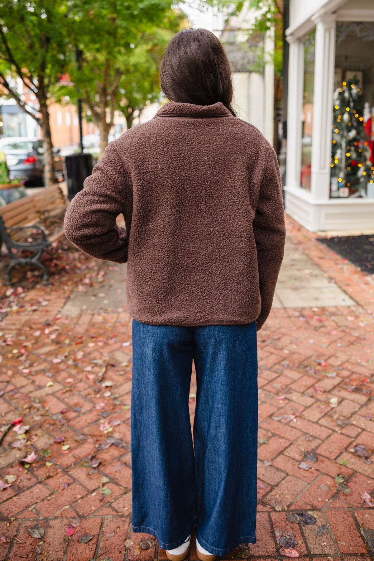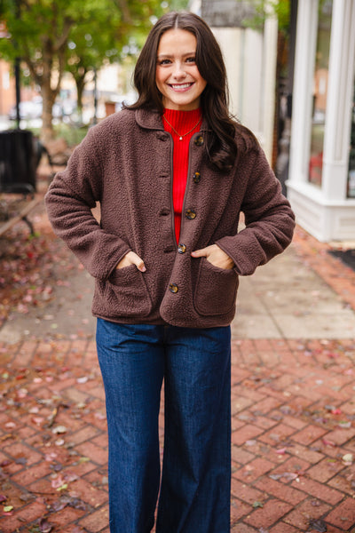 Espresso sherpa button down shirt jacket with double front pockets and button cuffs