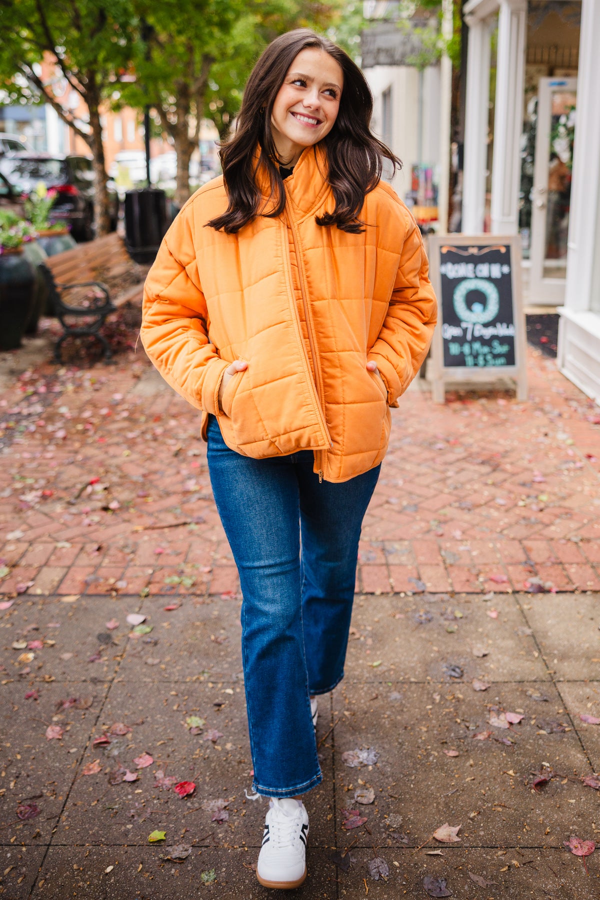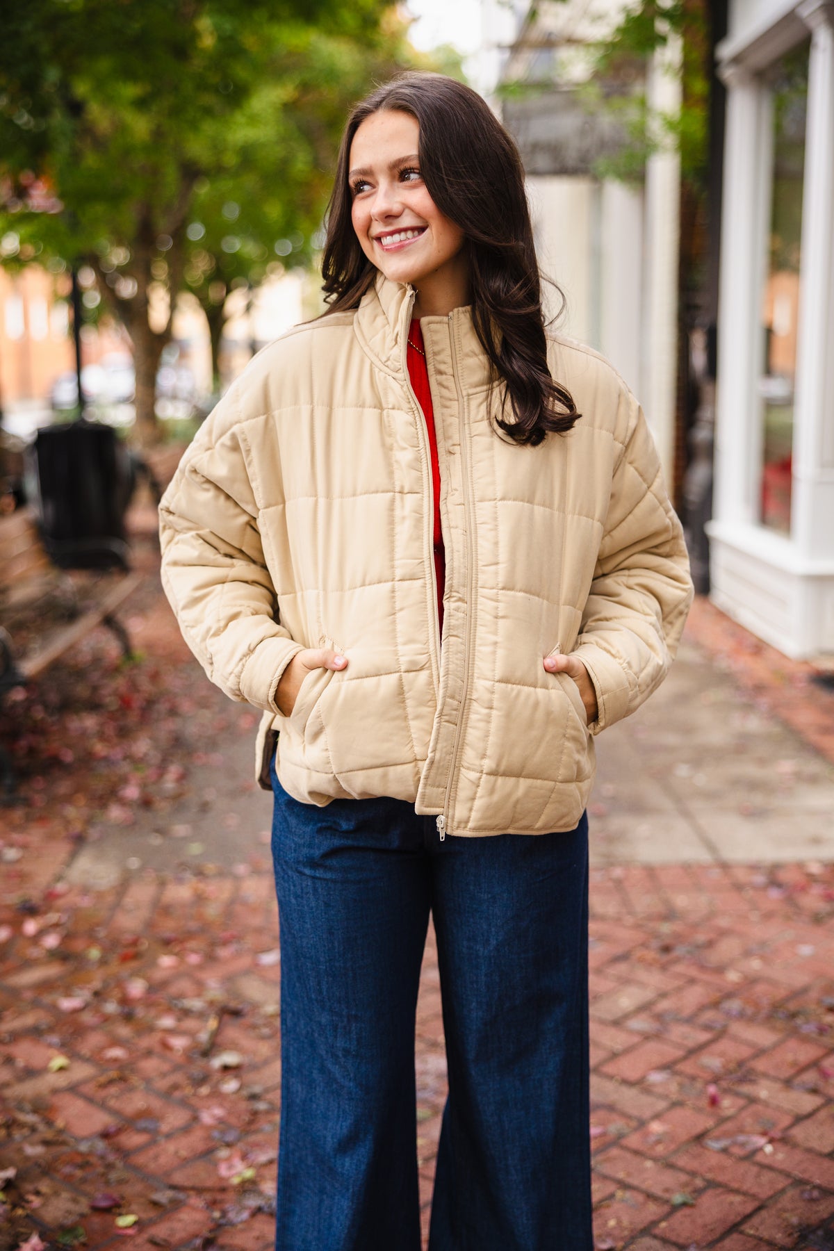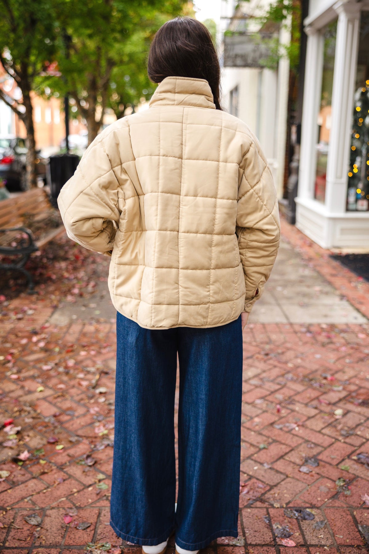 Khaki leopard print quilted puffer jacket with snap close and side pockets