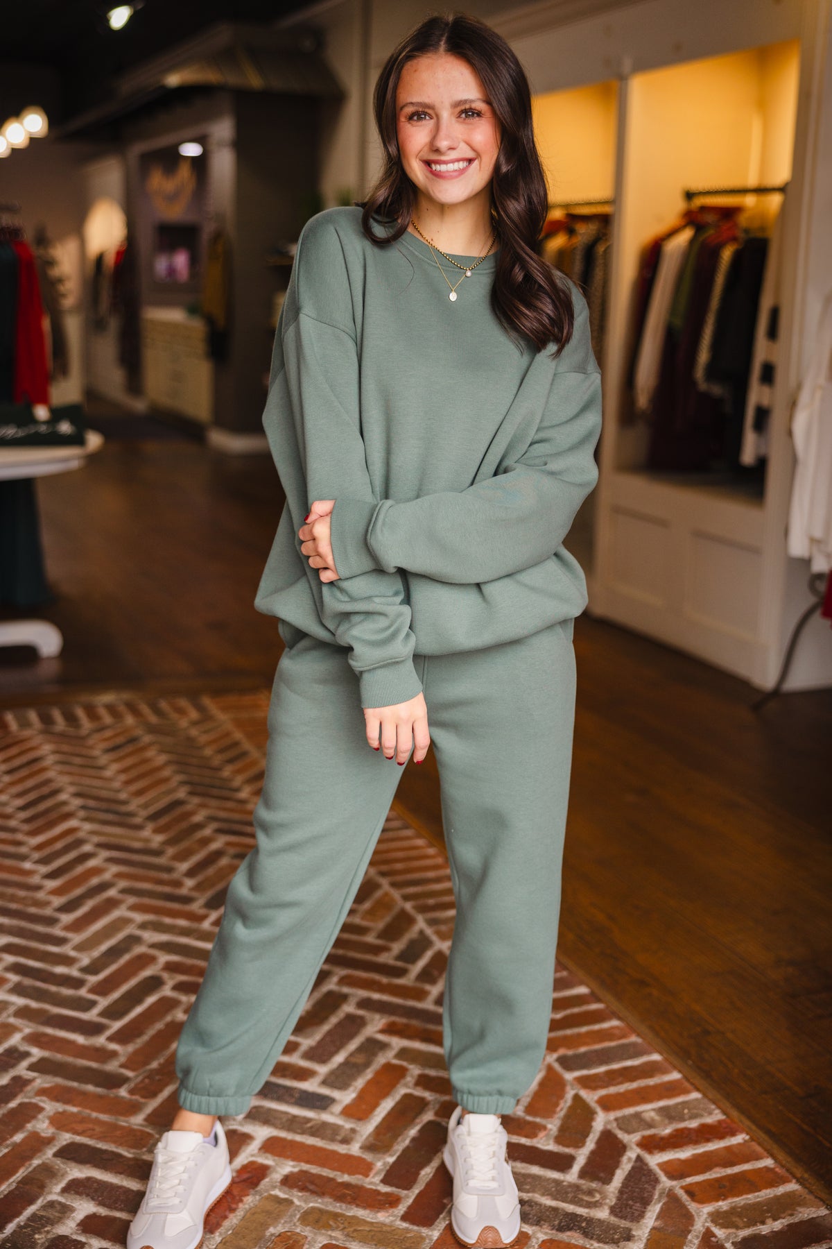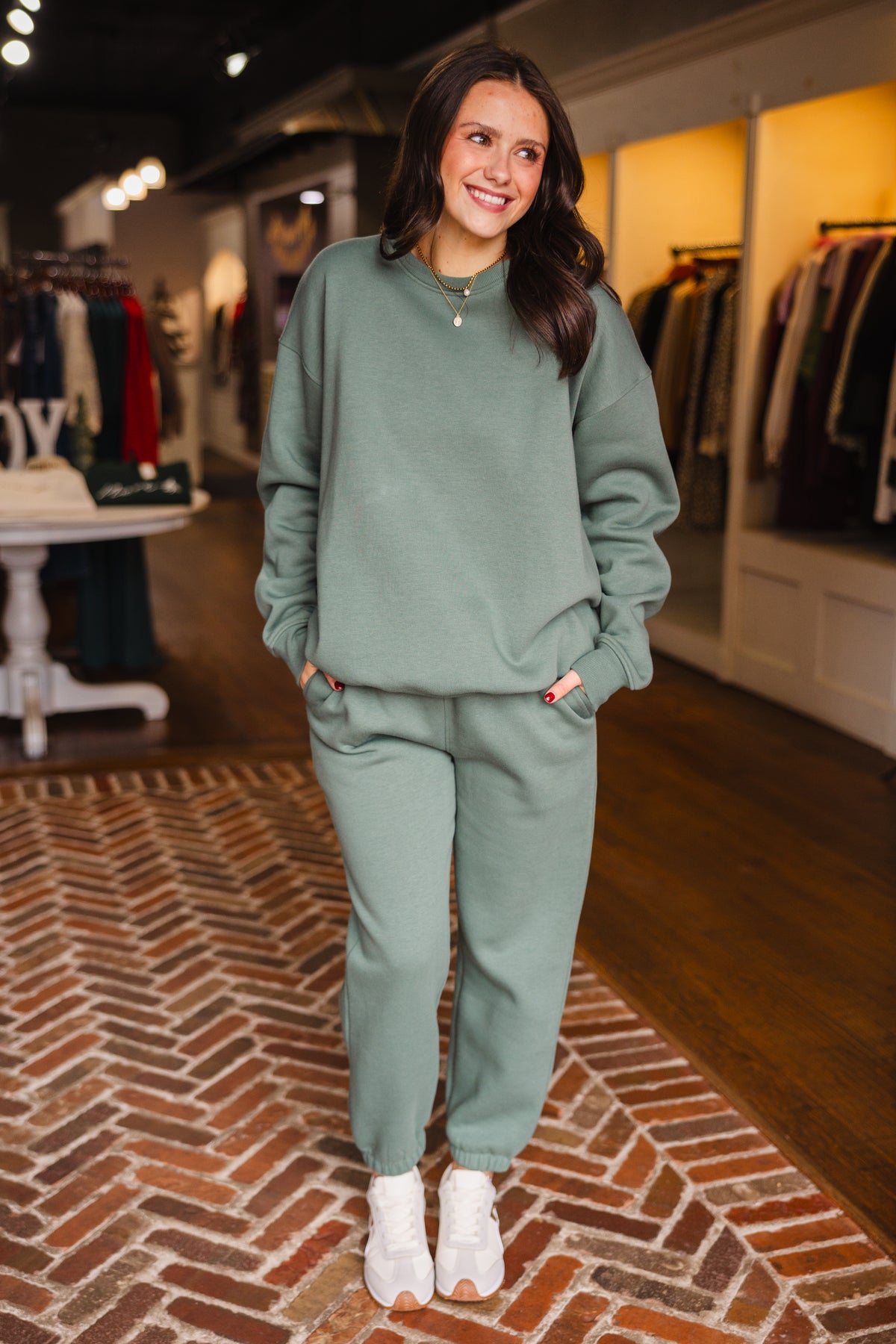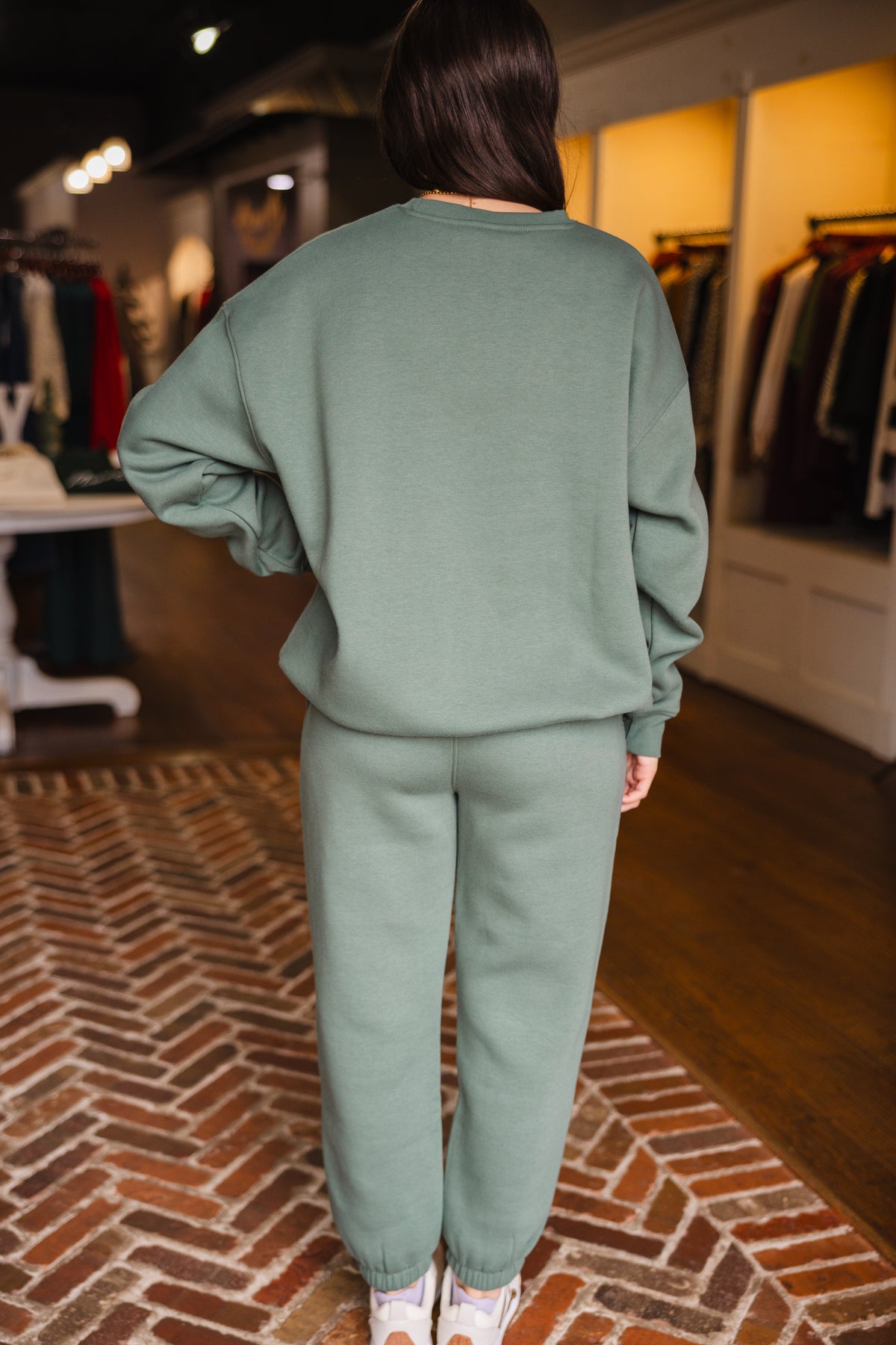 Eldergreen fleece billow sweatpants with an elastic waistband and side pockets, banded bottom