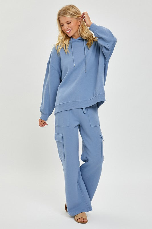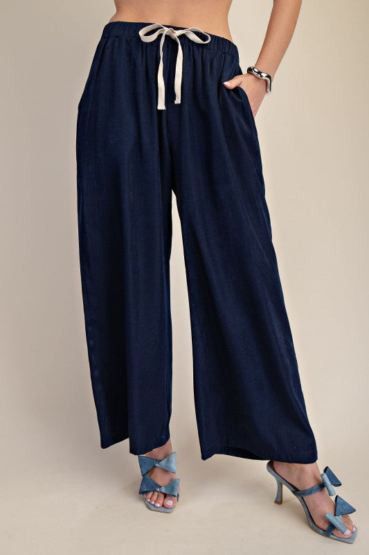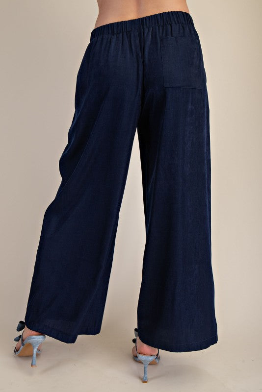Dusty indigo wide leg pants with an elastic waistband and side pockets