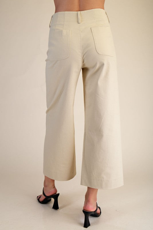 Bone cropped wide leg pants with scalloped pockets, button close, back pockets and belt looks