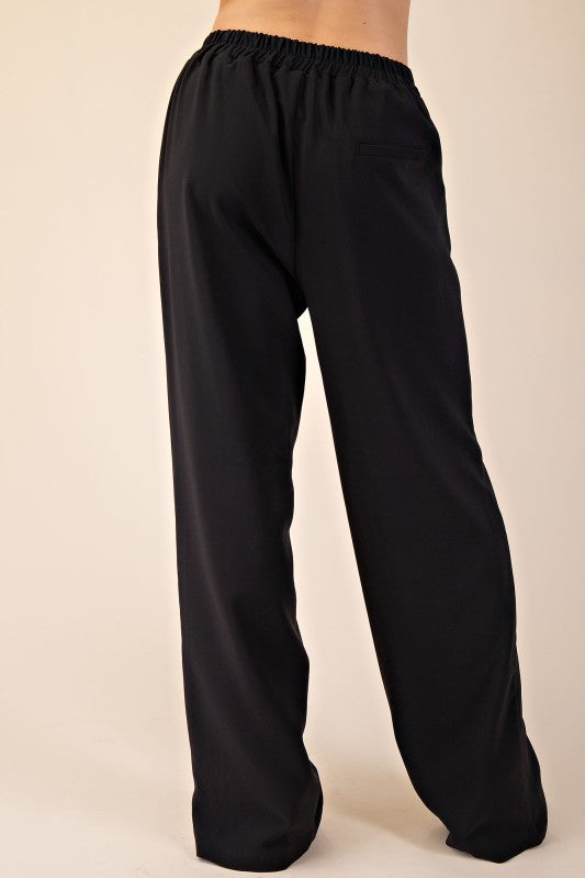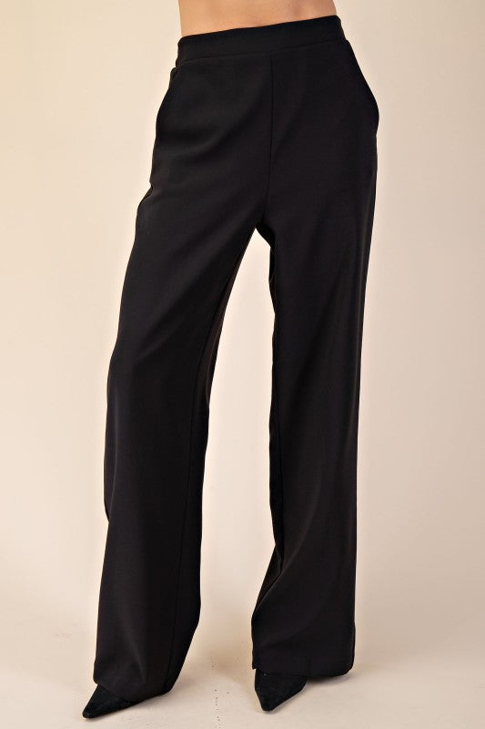 High rise wide leg dress pants, flat front with side pockets and a back elastic waistband