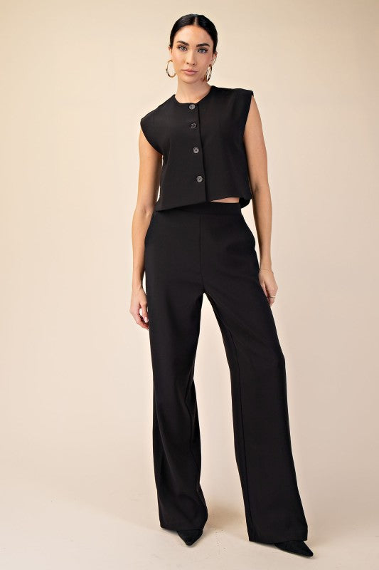 Black gold button detail, straight leg pants, side zip close