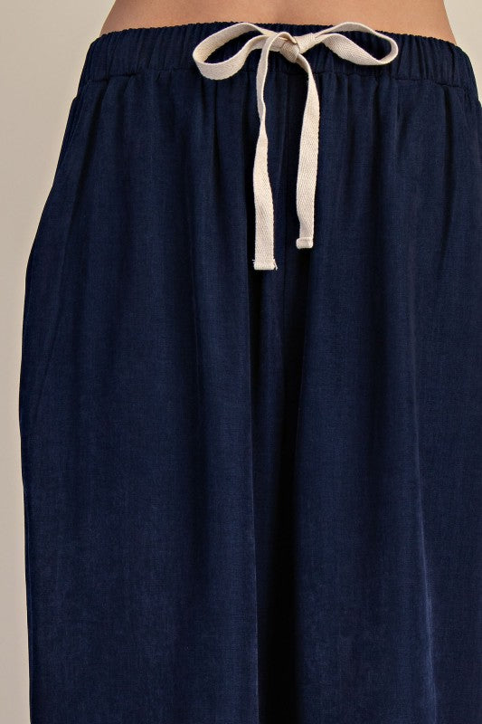 Navy elastic waist drawstring pants with side pockets