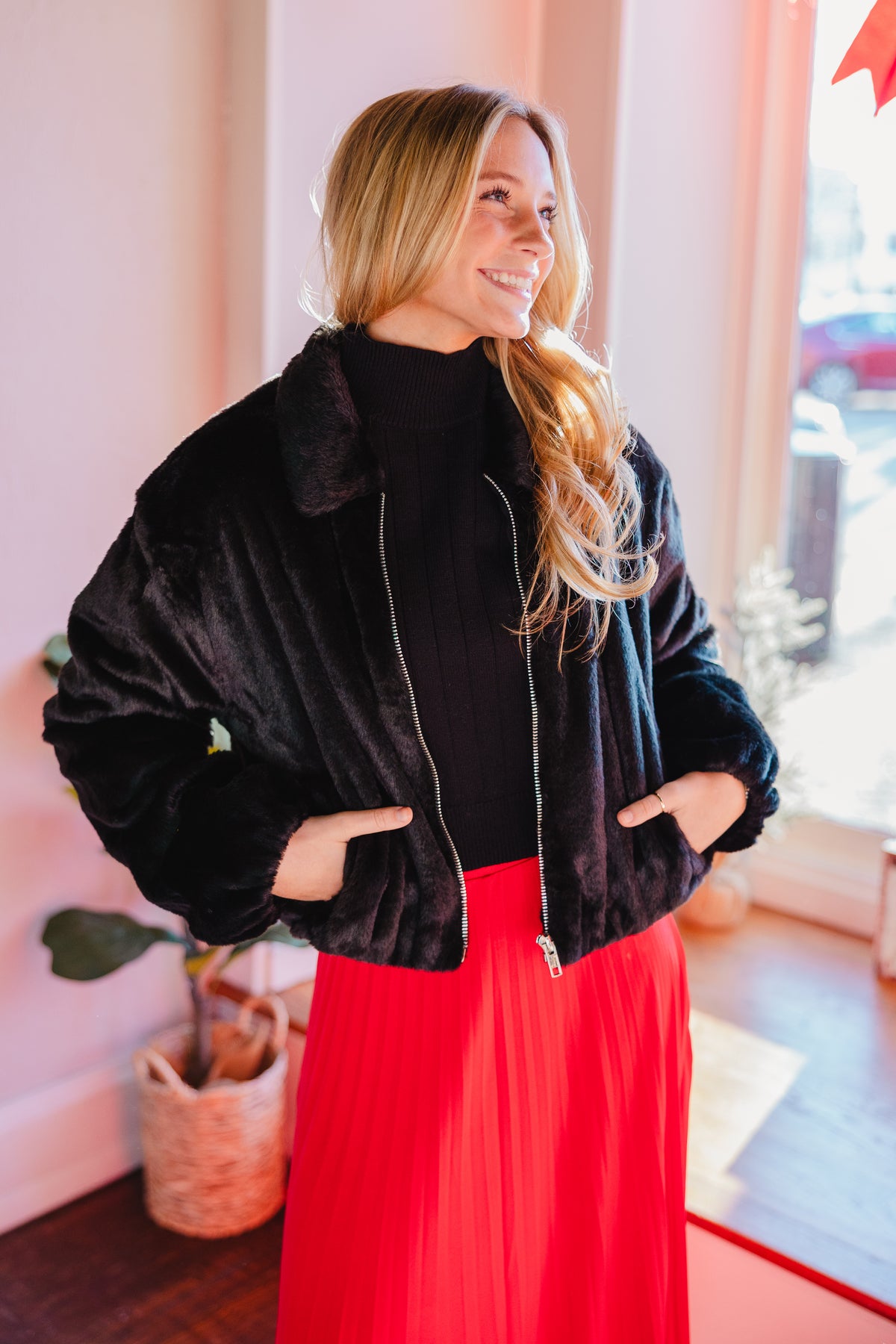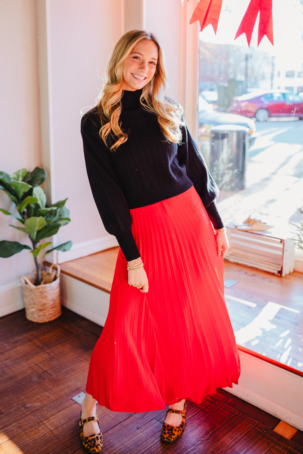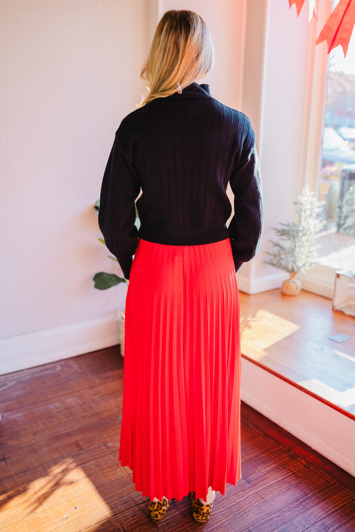 Red pleated maxi skirt
