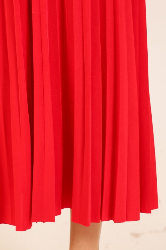Red pleated holiday maxi skirt with an elastic waistband