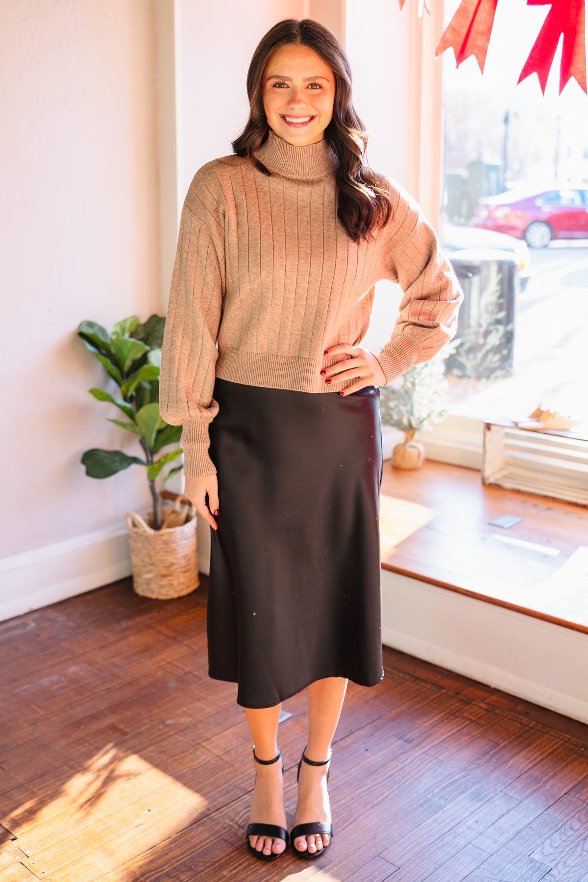 Dark taupe midi skirt with an elastic waistband and side pockets