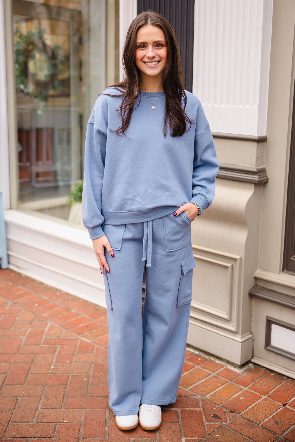 Blue high rise wide leg sweatpants with a drawstring waistline, front and side pockets