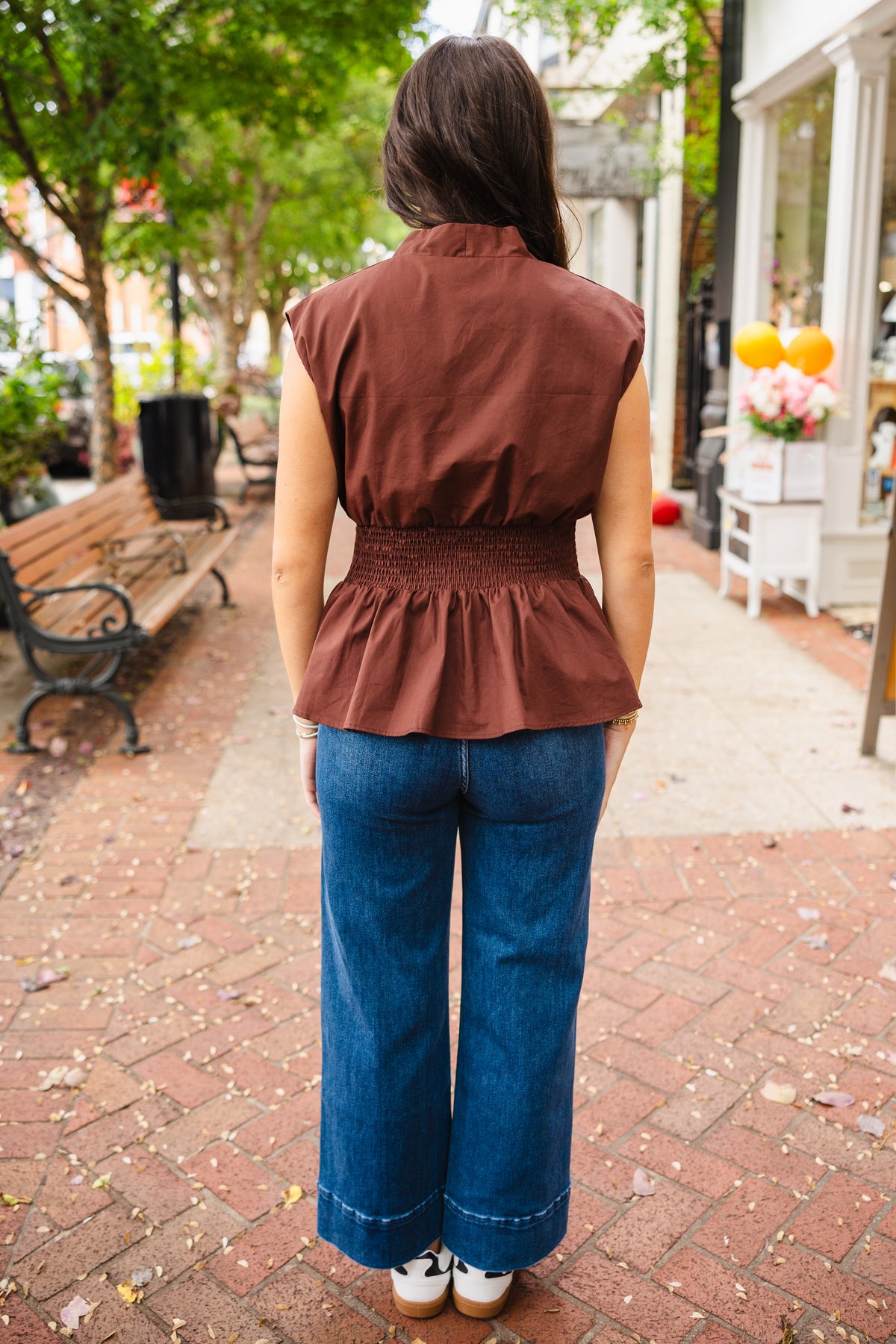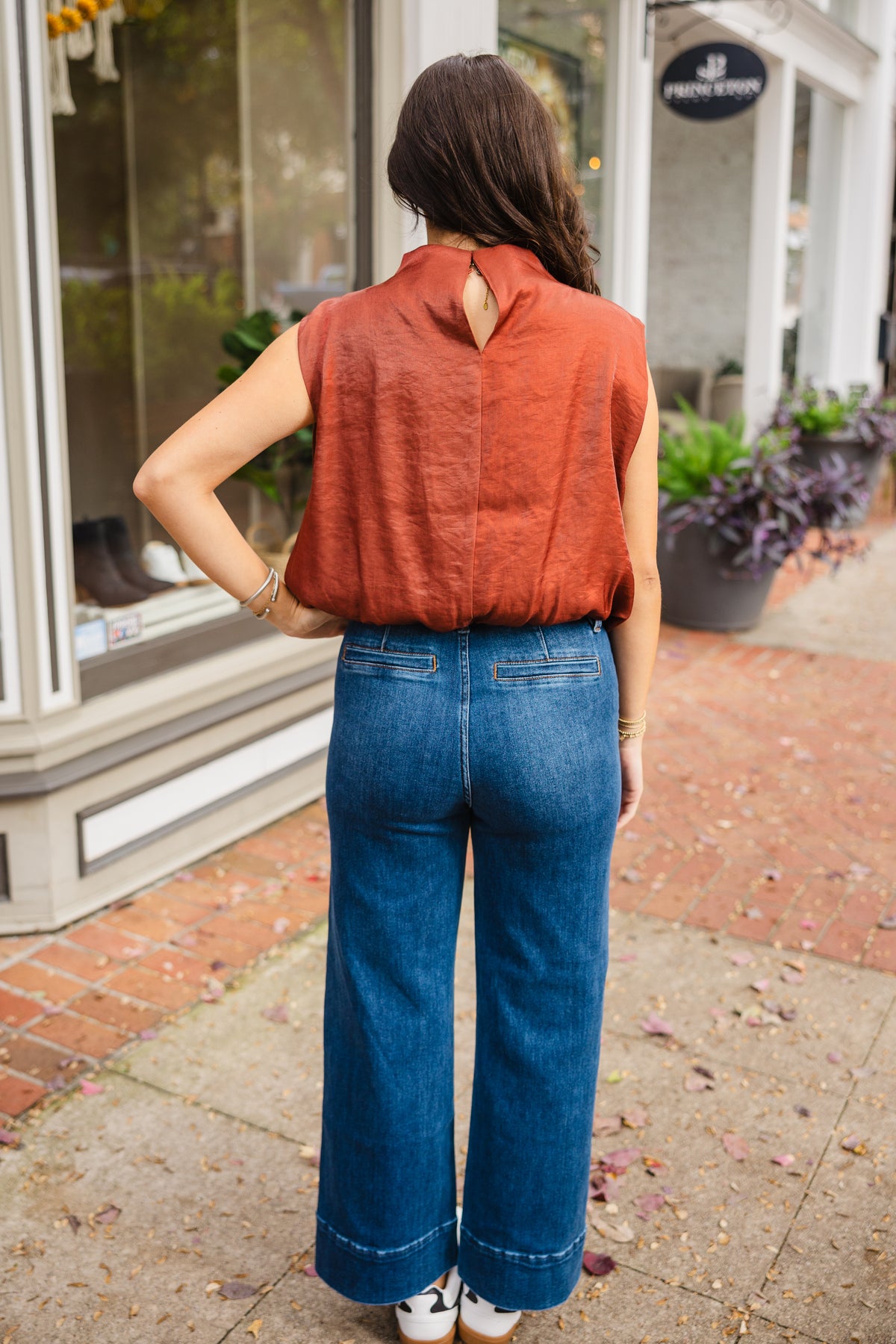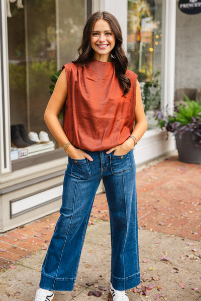 Rust mock neck sleeveless dress with pleat detail on the shoulders and a self tie belt, back button close