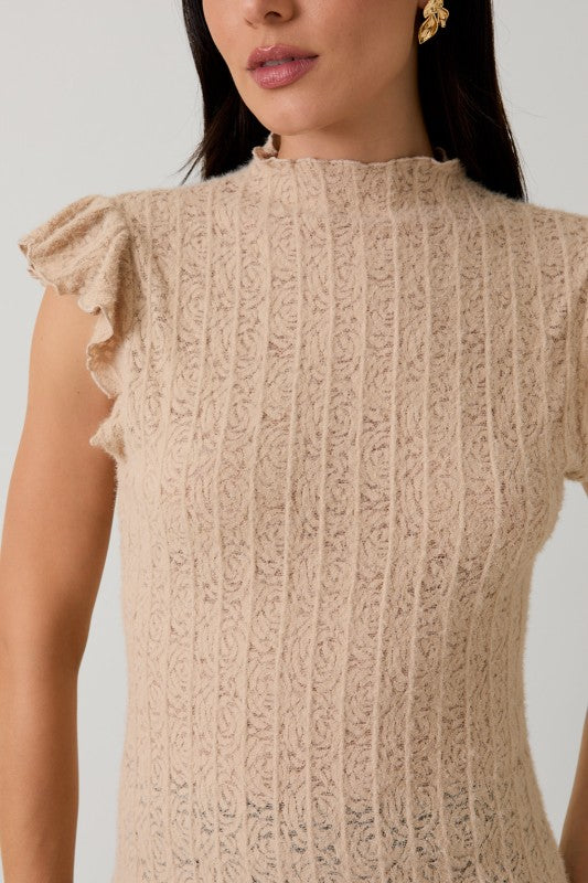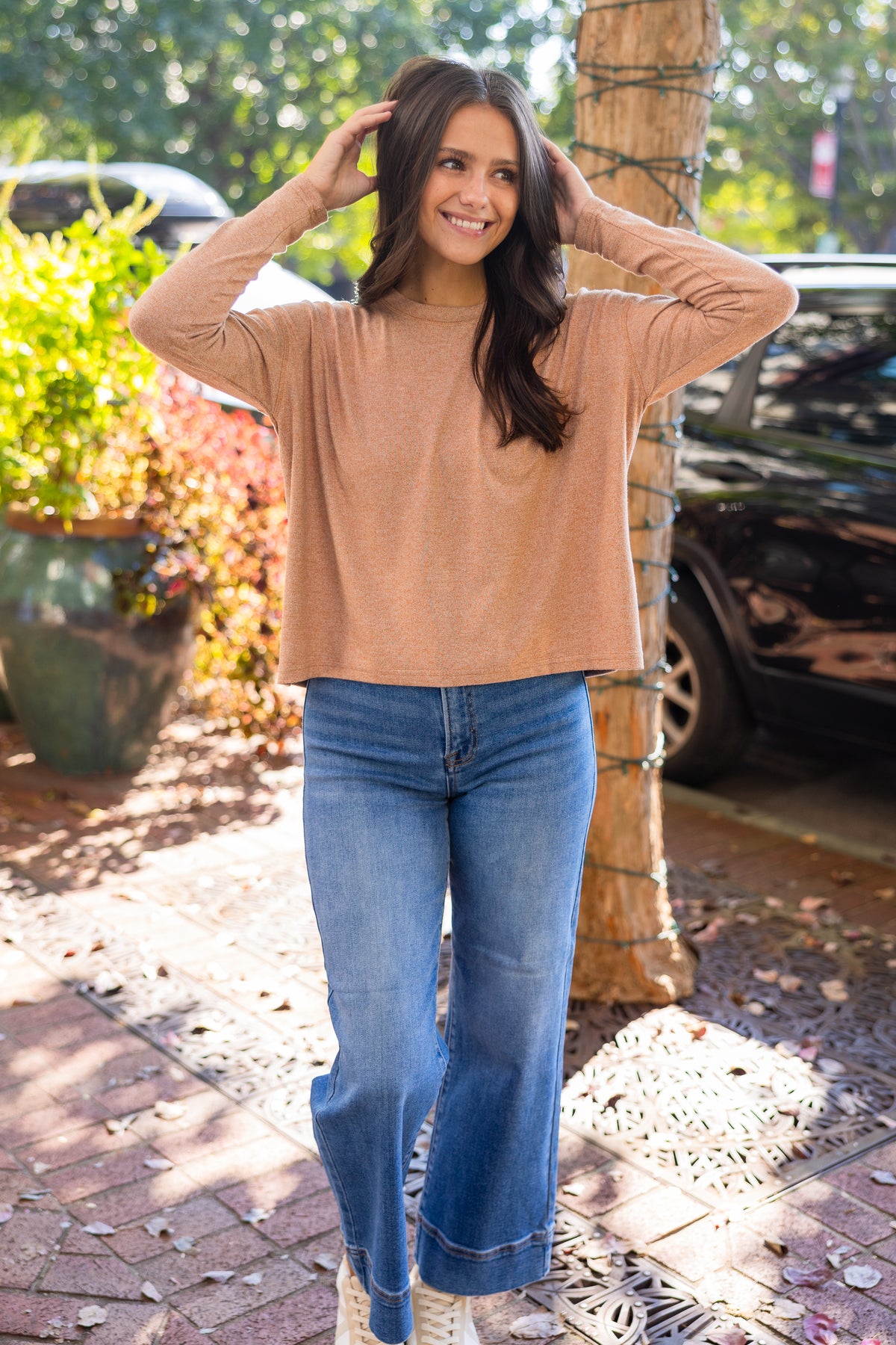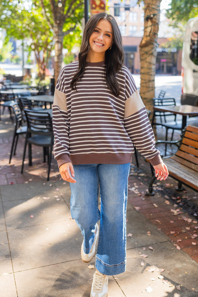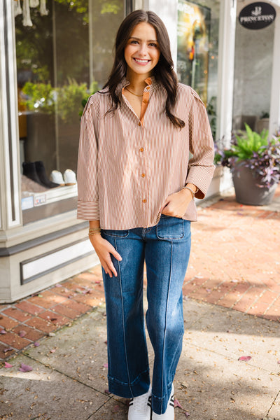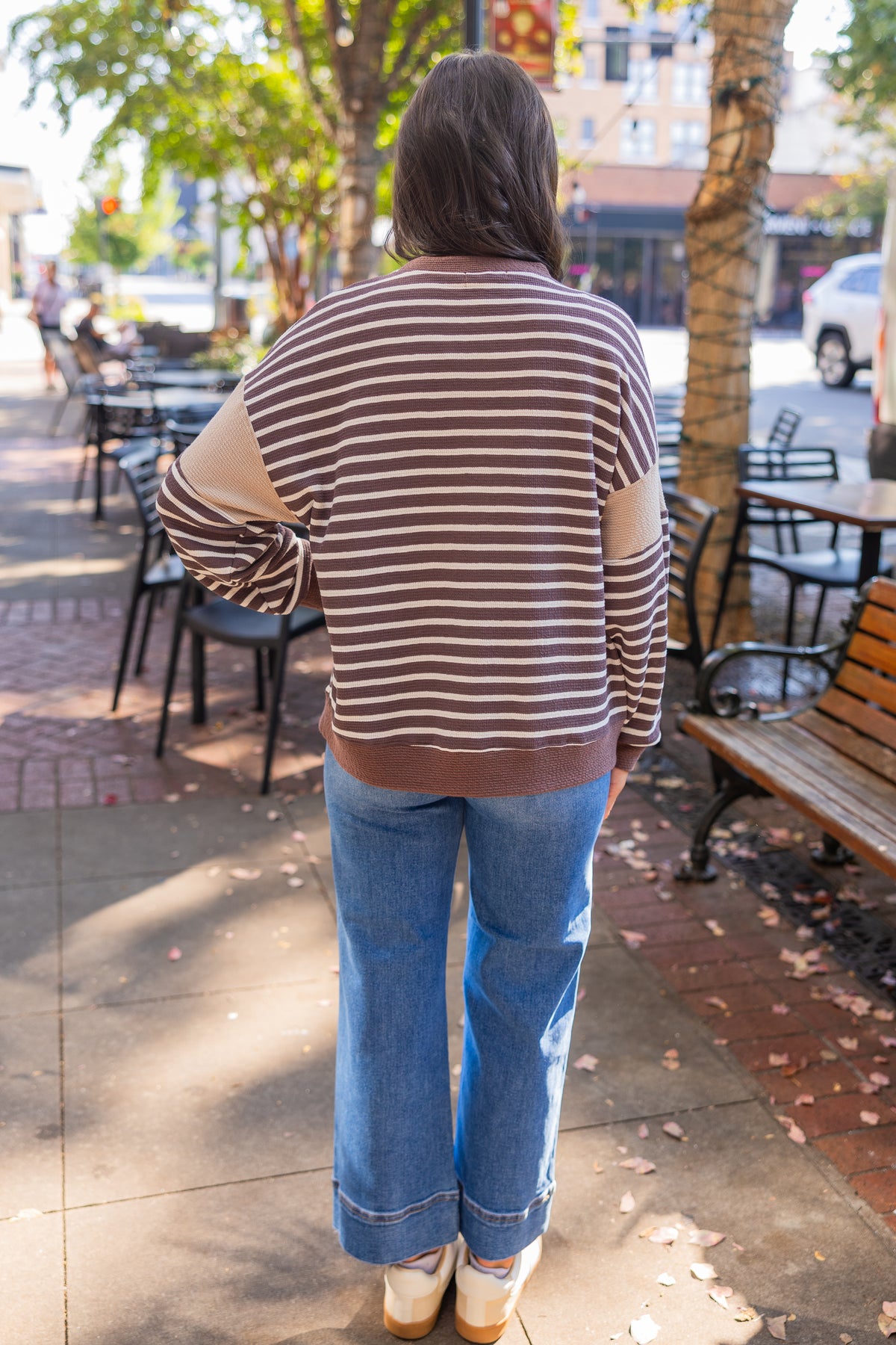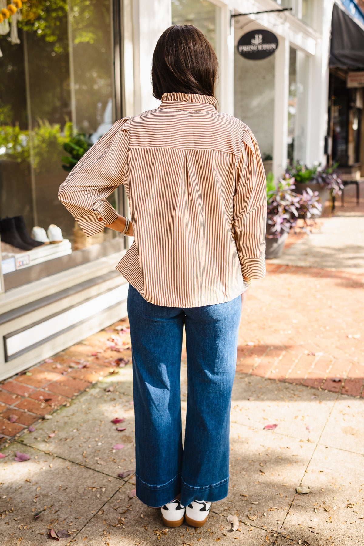 Mocha striped 3/4 sleeve top with ruffle trim around the neckline
