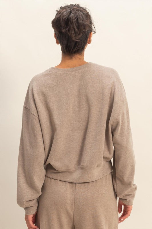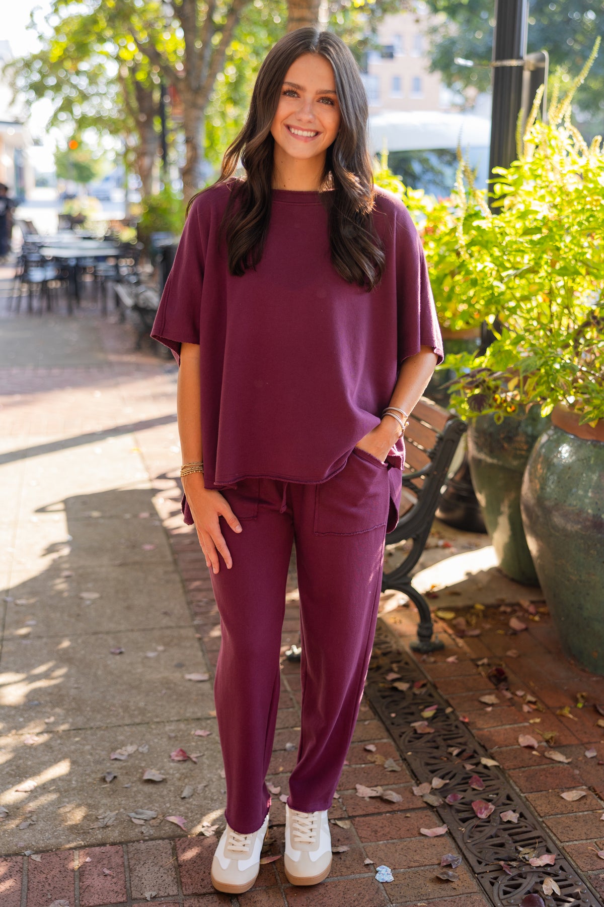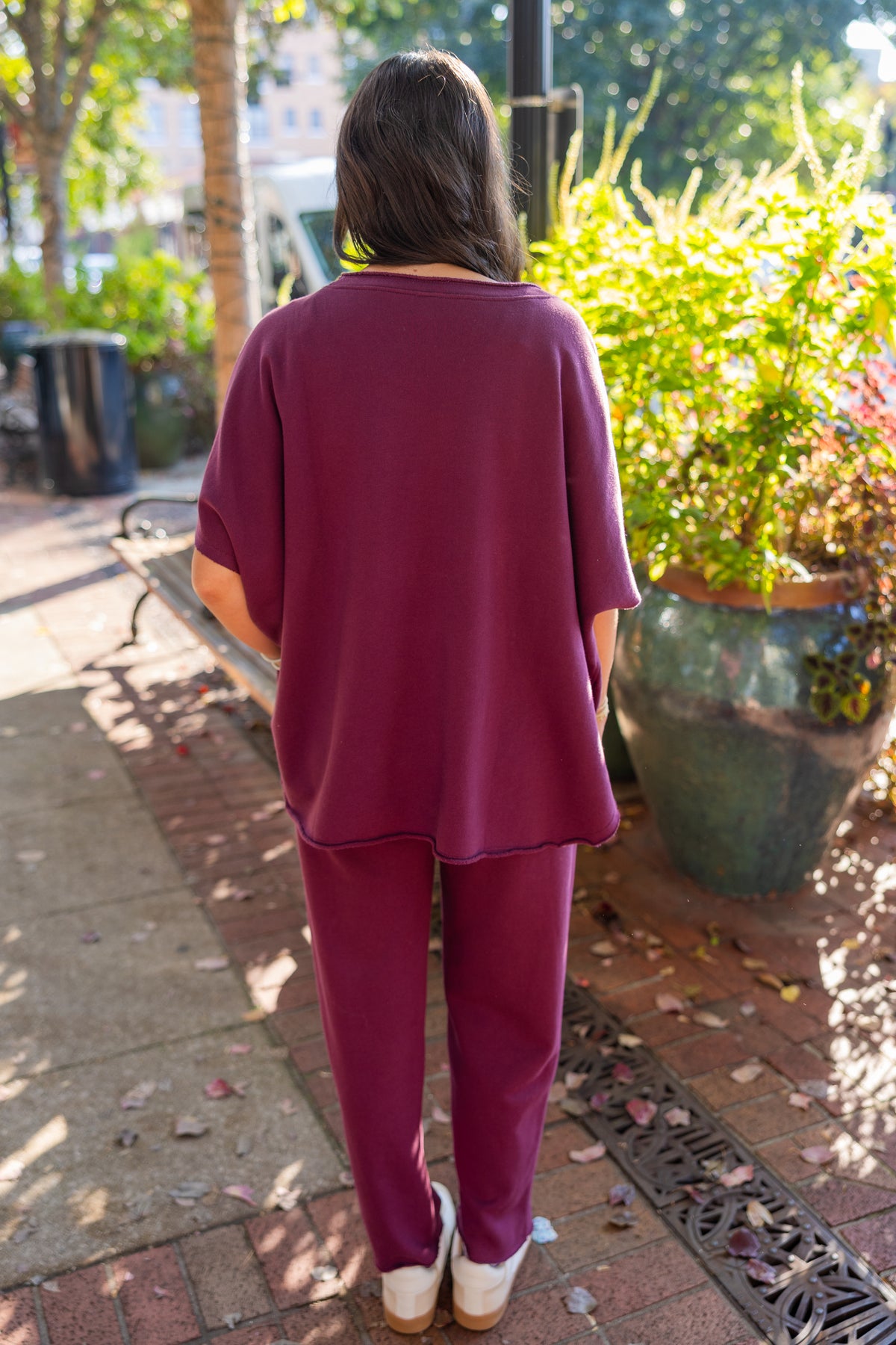 Malibu vintage dolman short sleeve pullover with a raw edge hem in dark plum