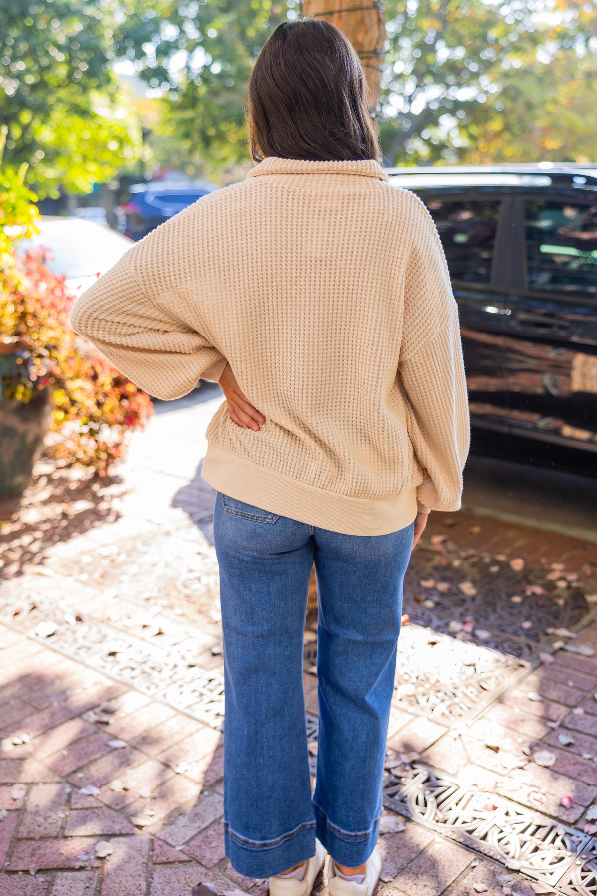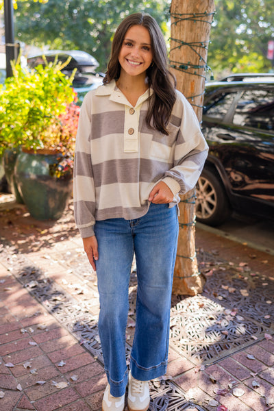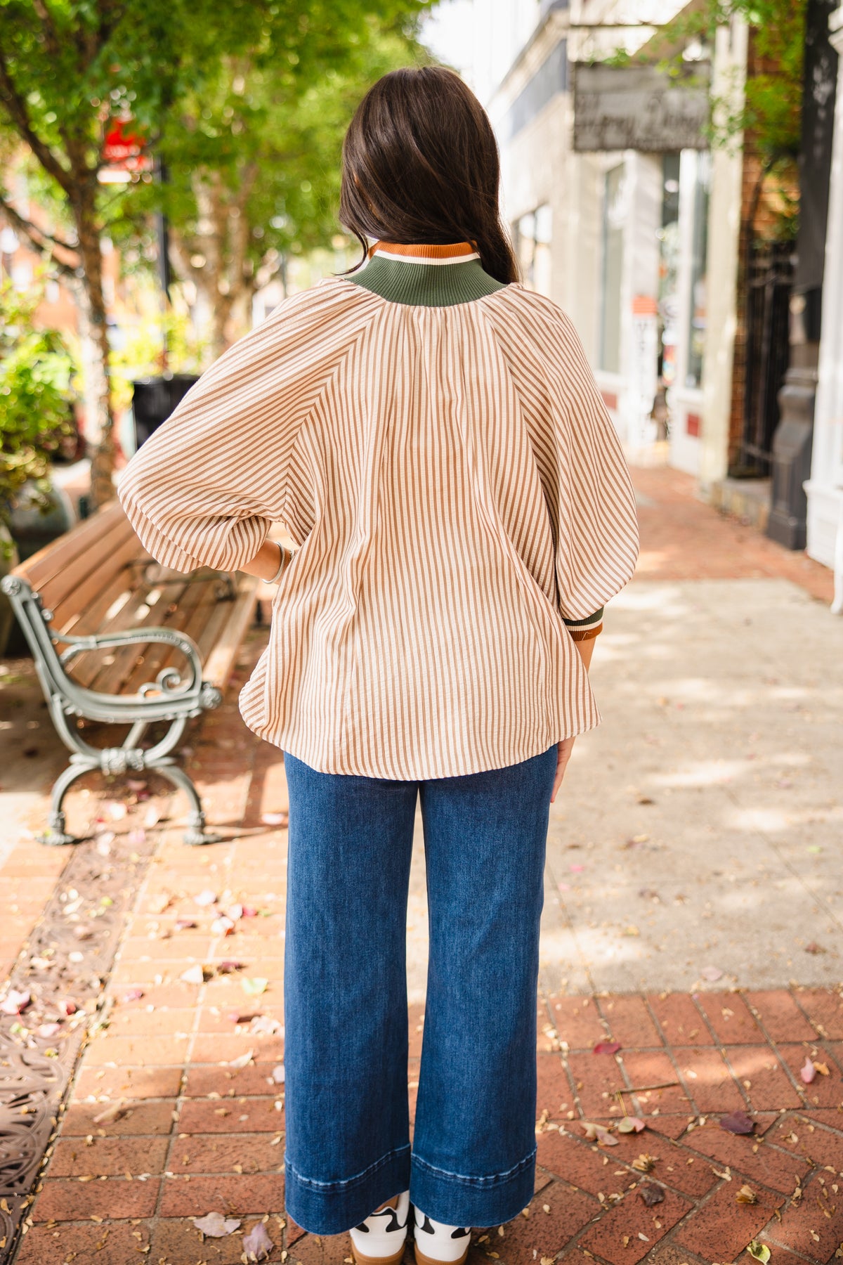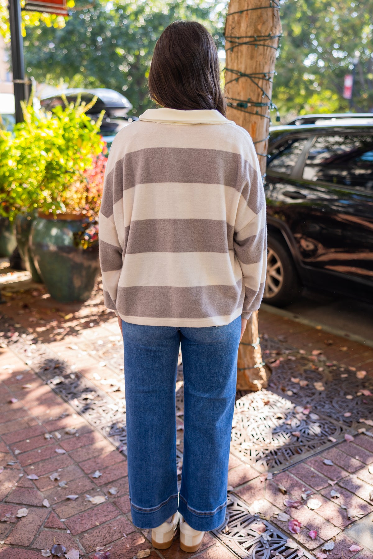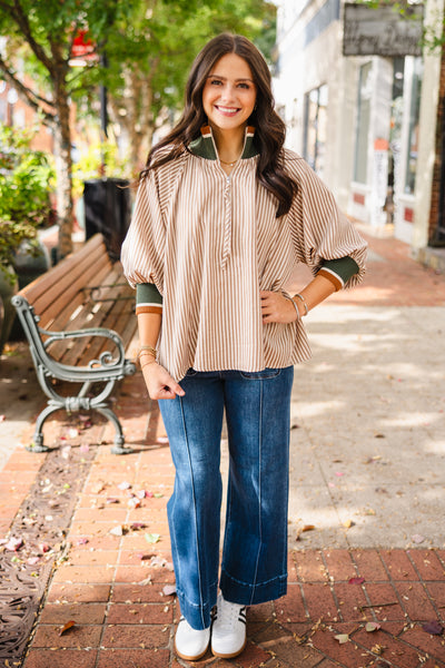 3/4 sleeve half zip striped top in taupe with olive contrast trim