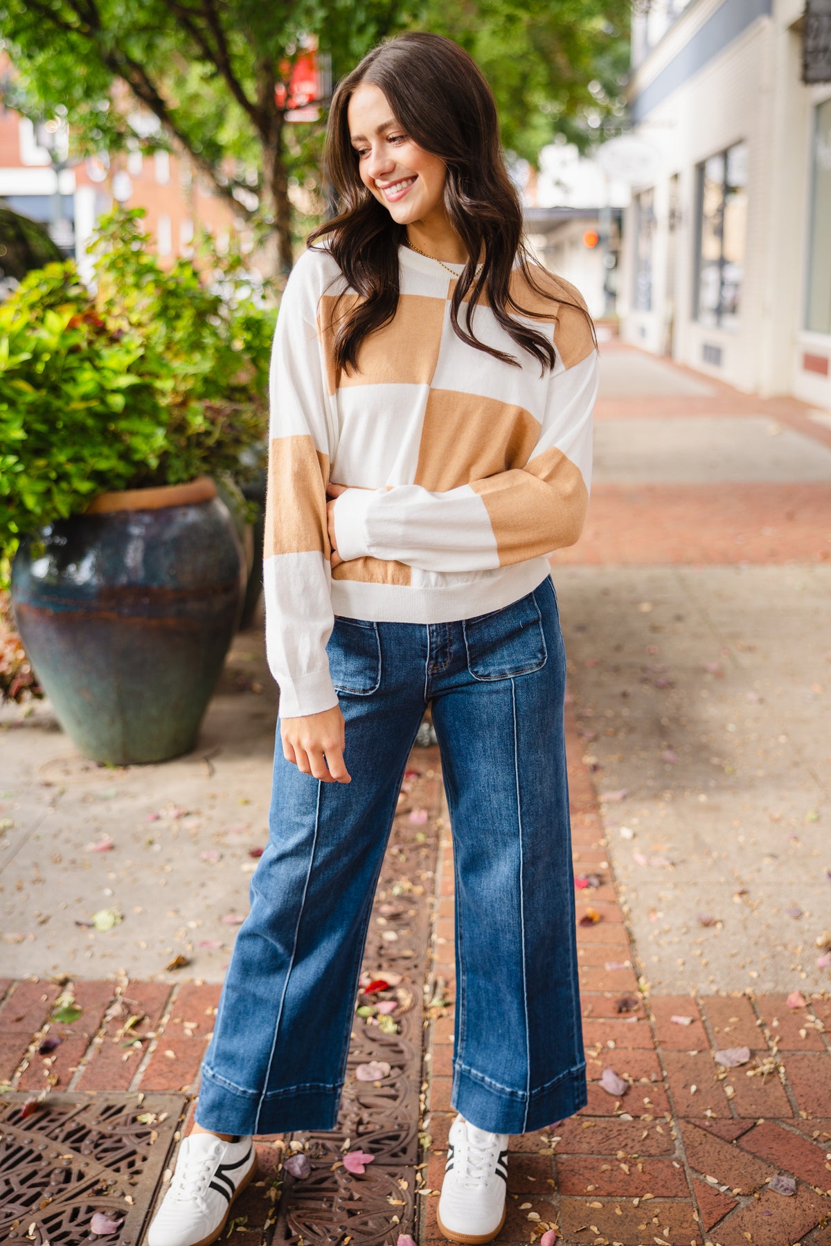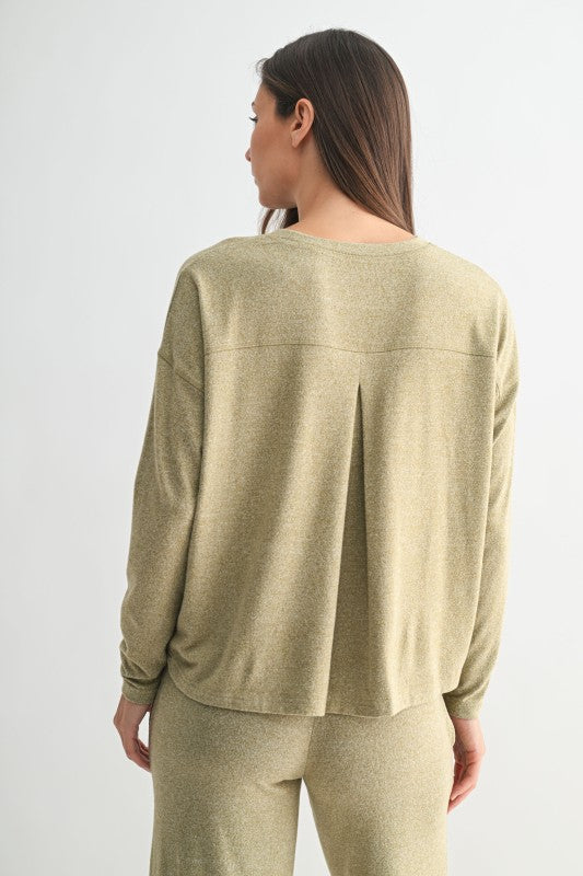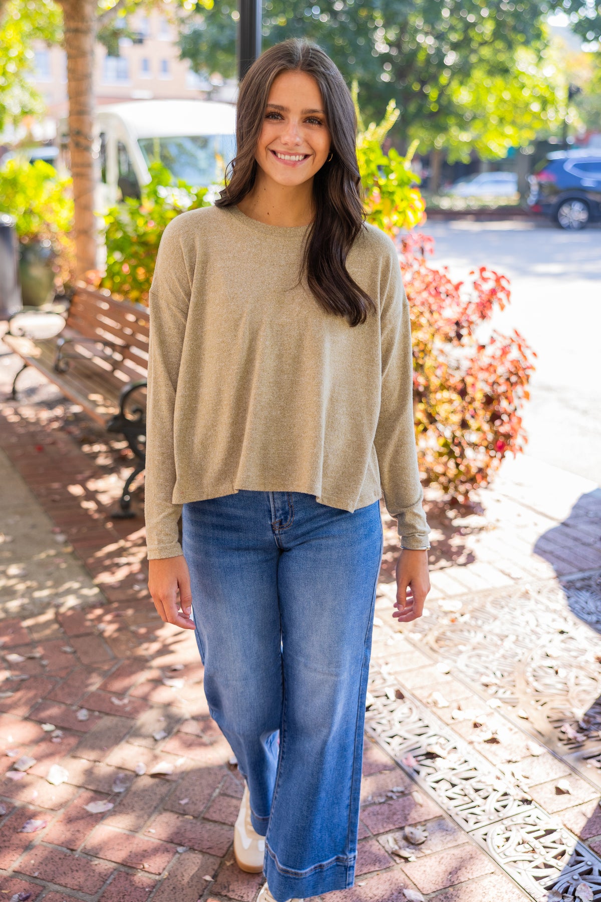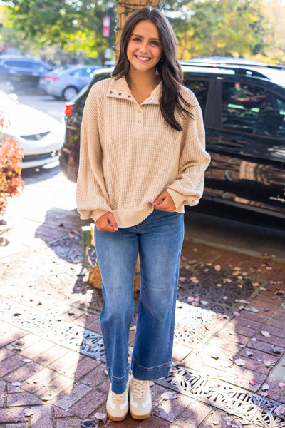 3/4 sleeve half zip striped top in taupe with olive contrast trim