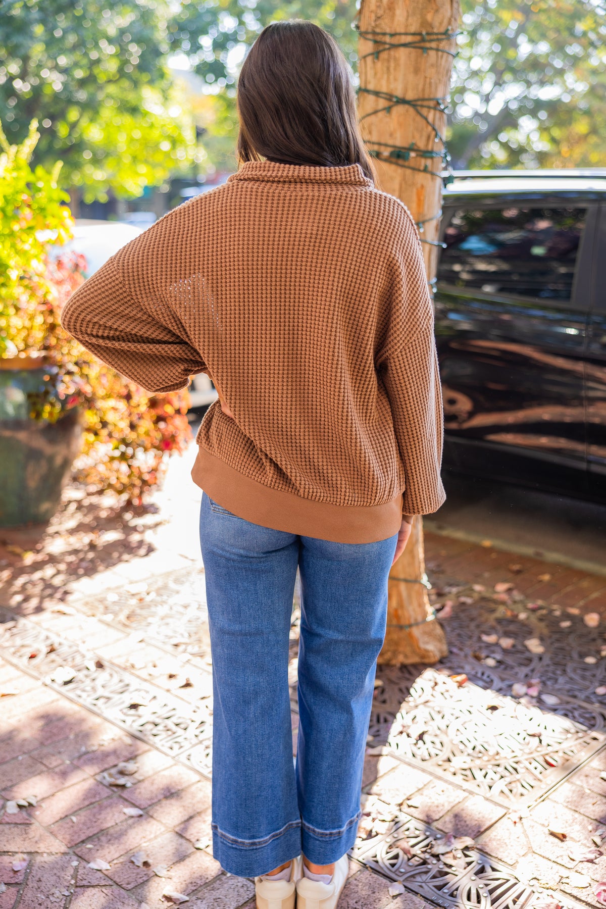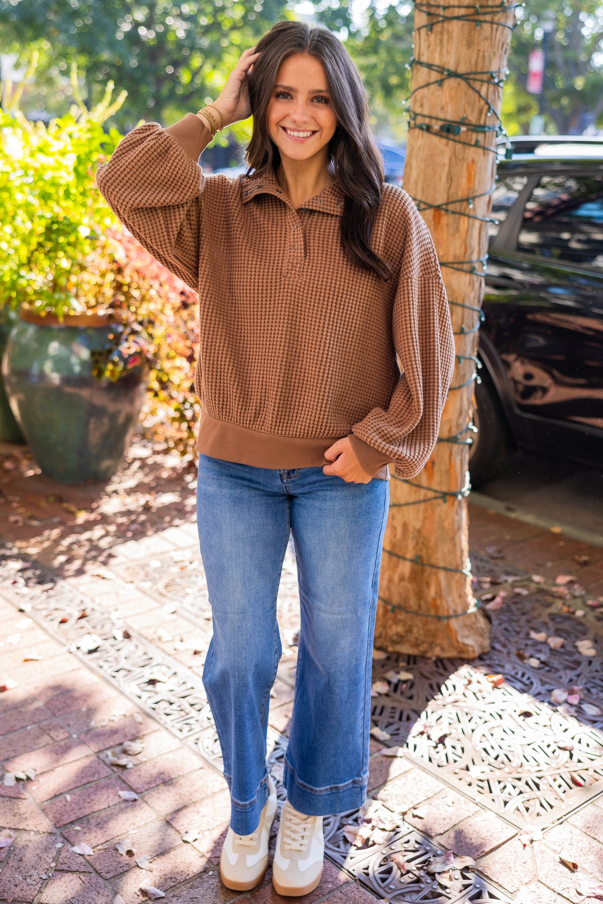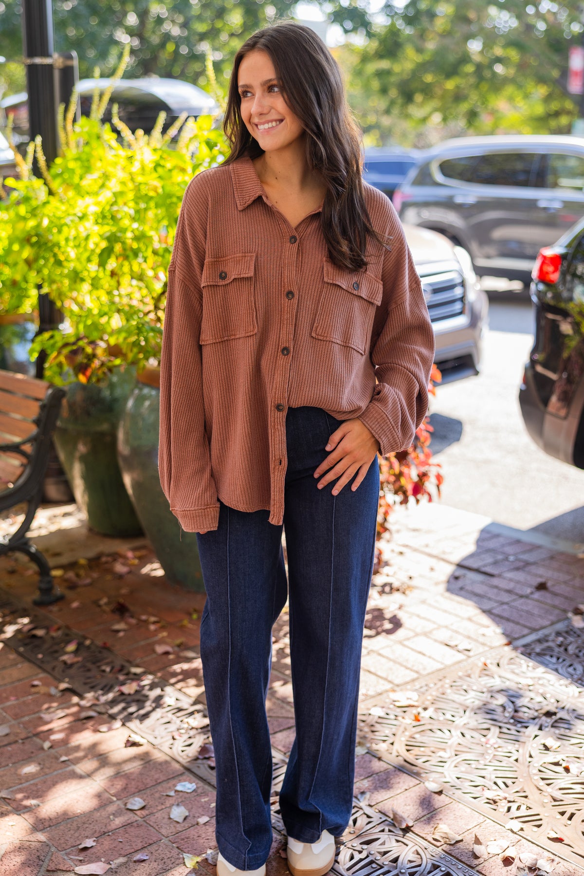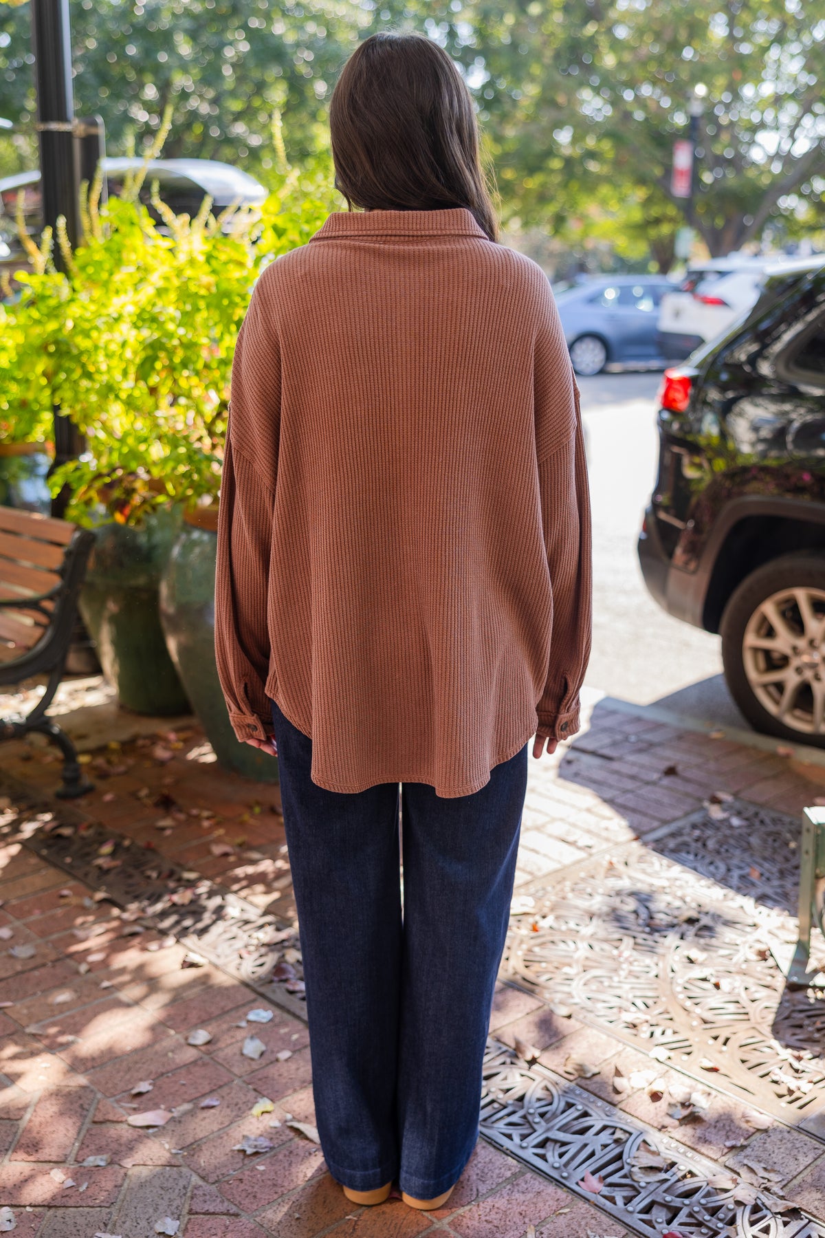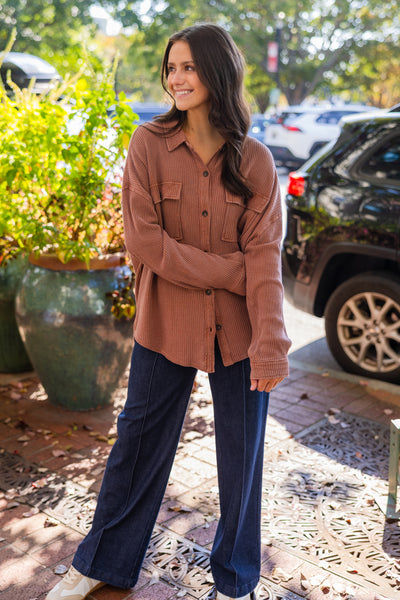 Chestnut oversized mineral washed waffle button up shacket with double front pockets