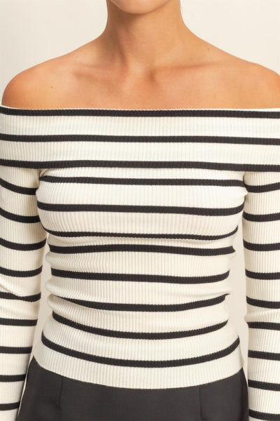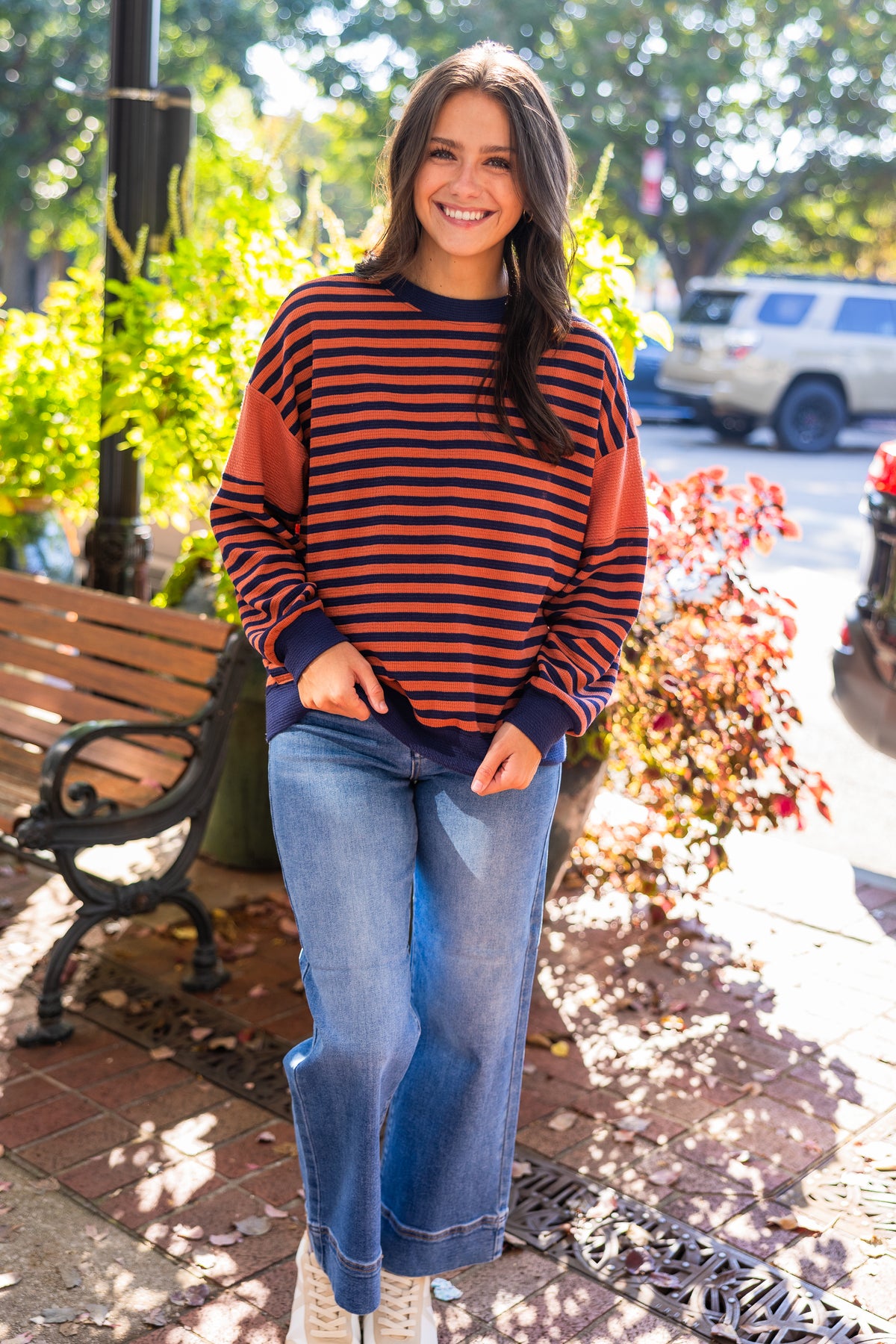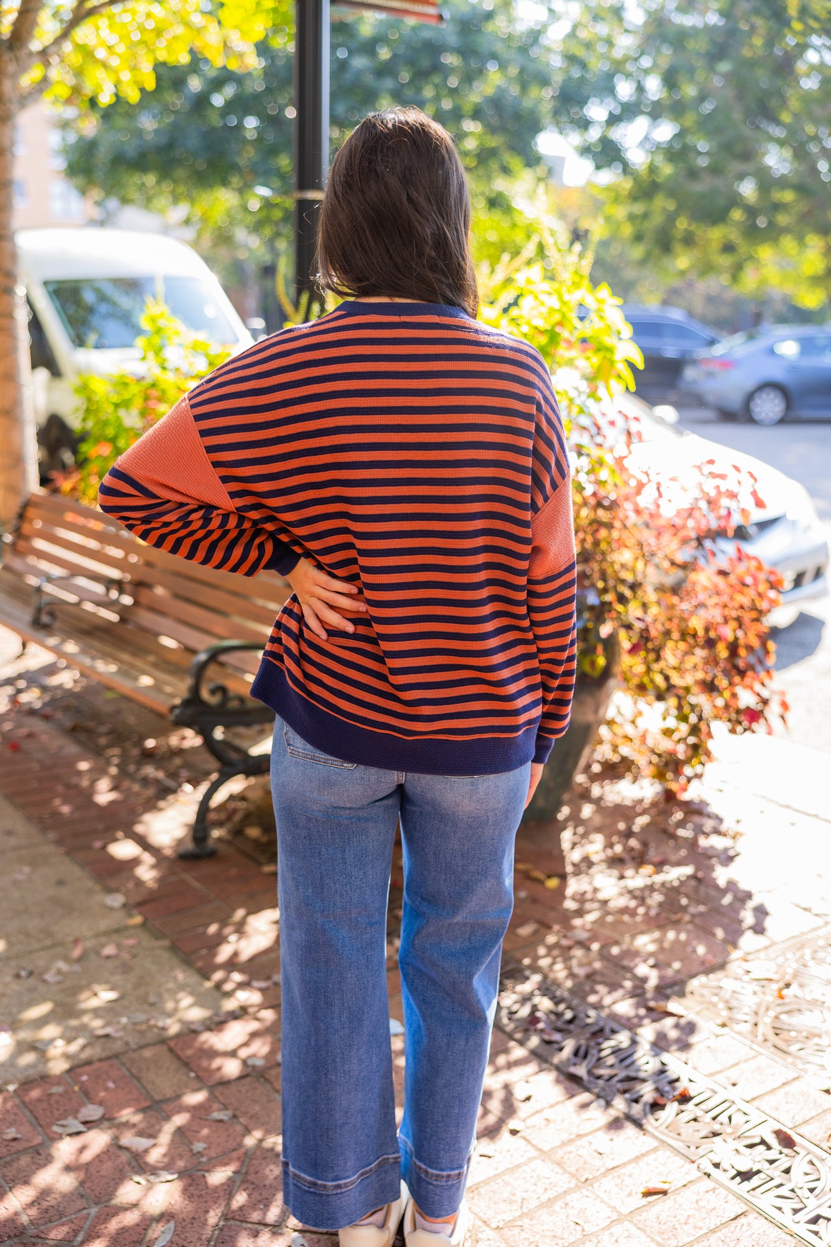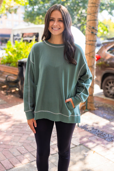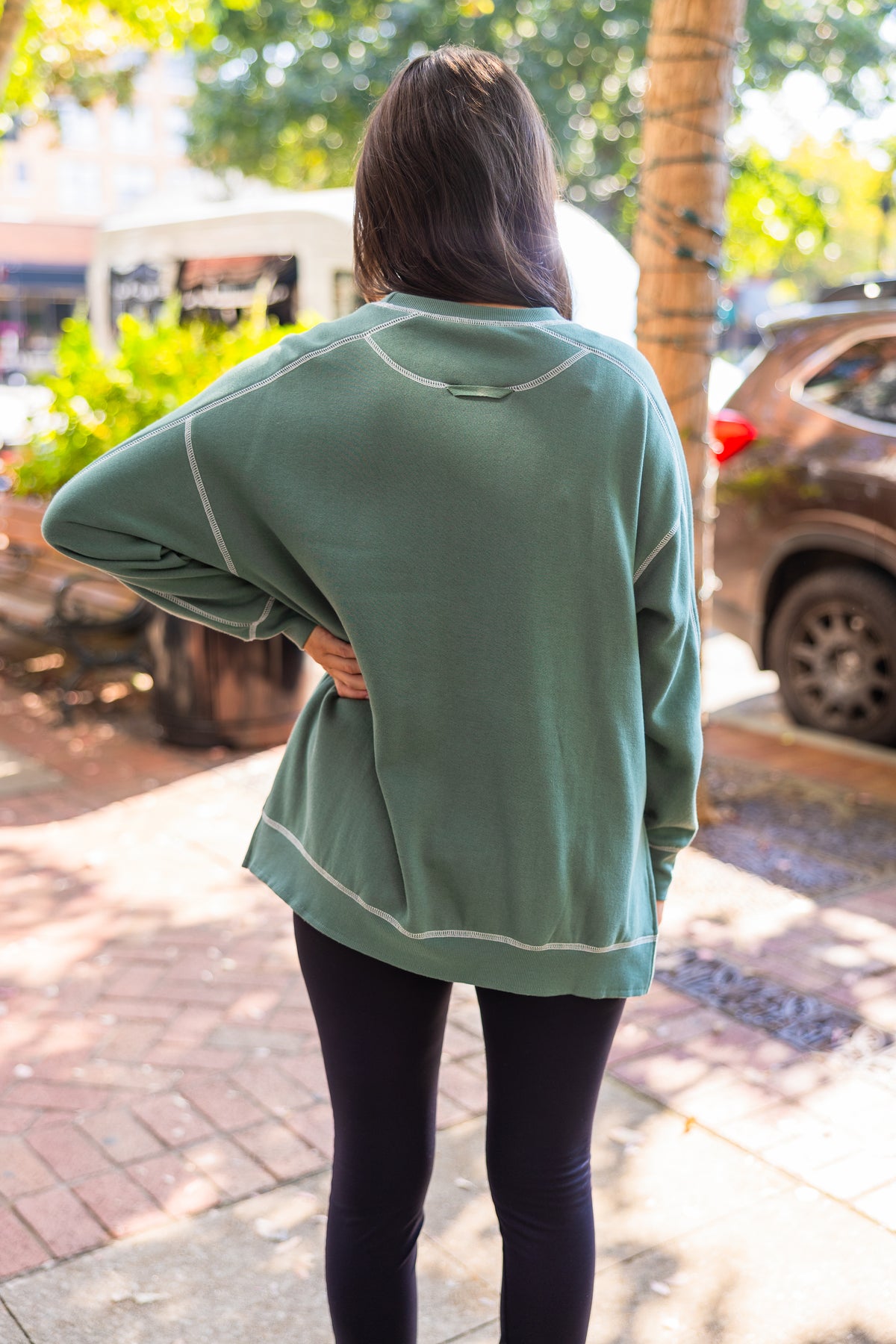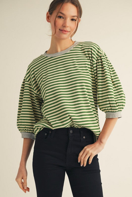Green stripe, ribbed pullover with contrast color trim in heather grey around the neck and cuffs