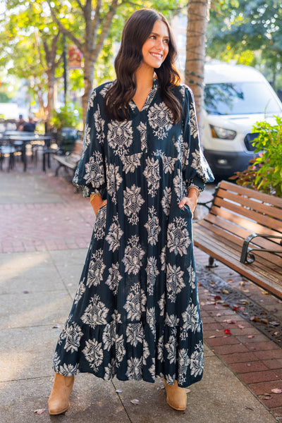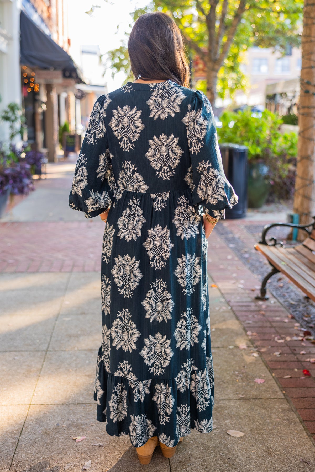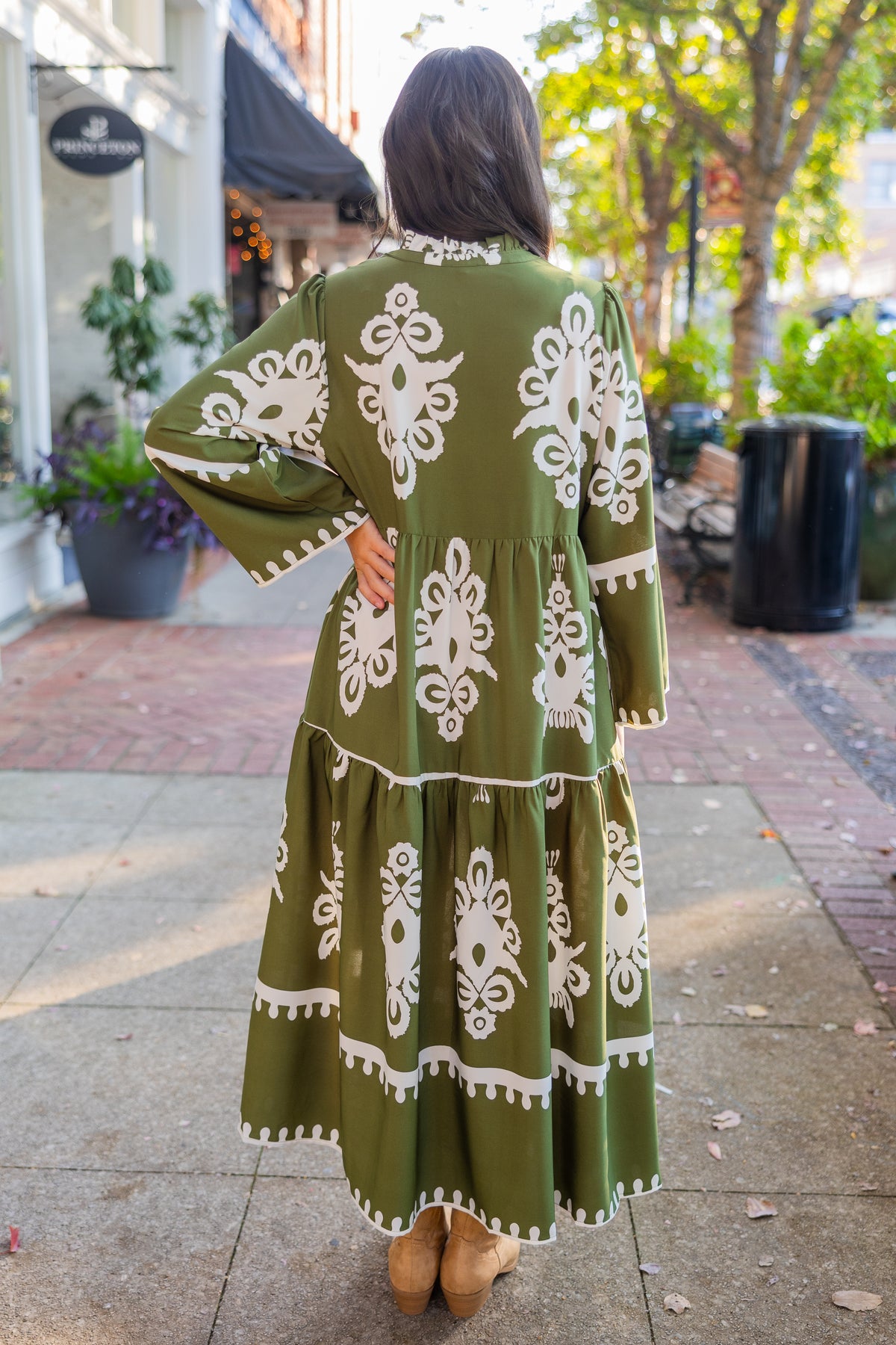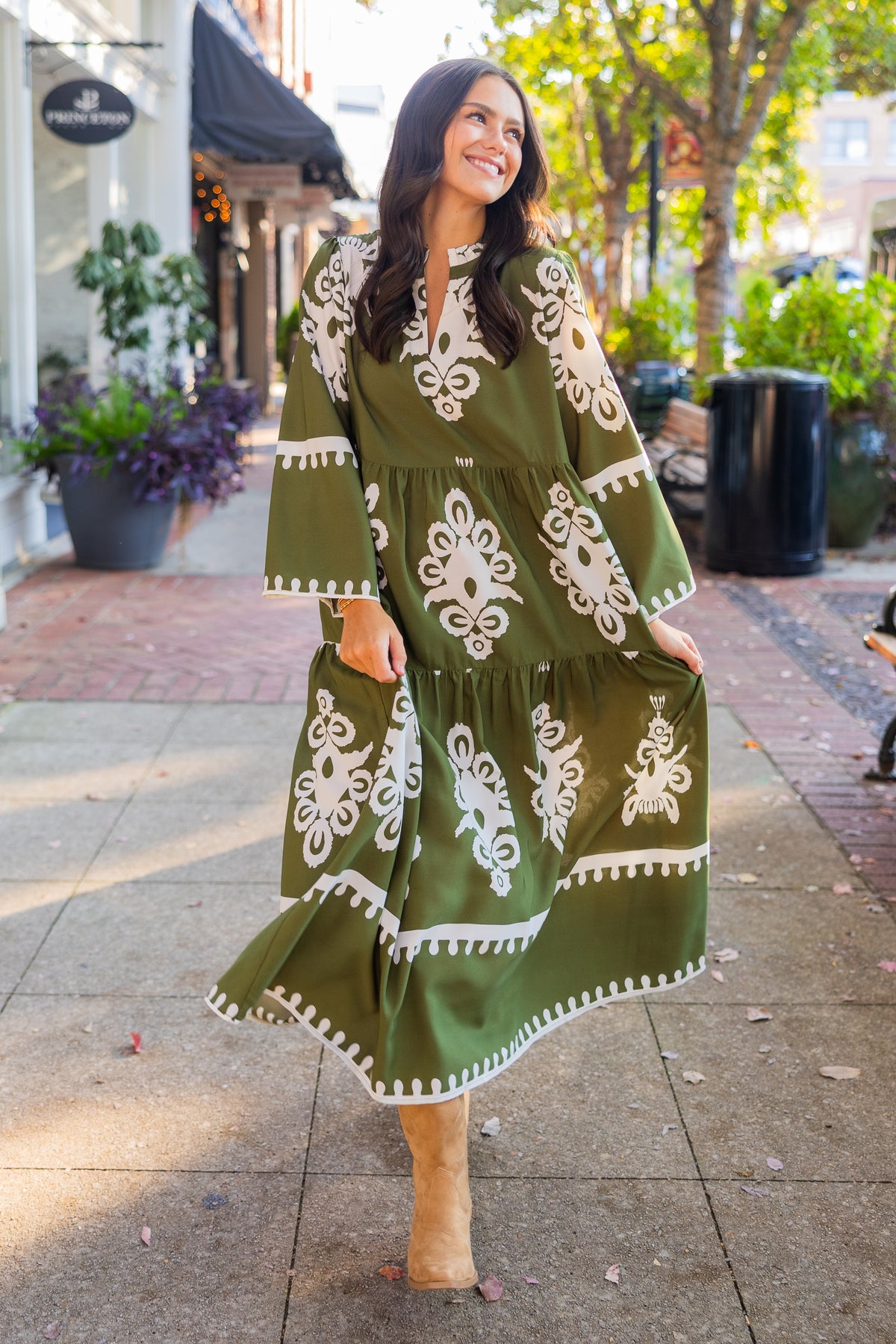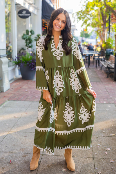 Olive damask print long sleeve midi dress with a V neckline and tiered hem skirt