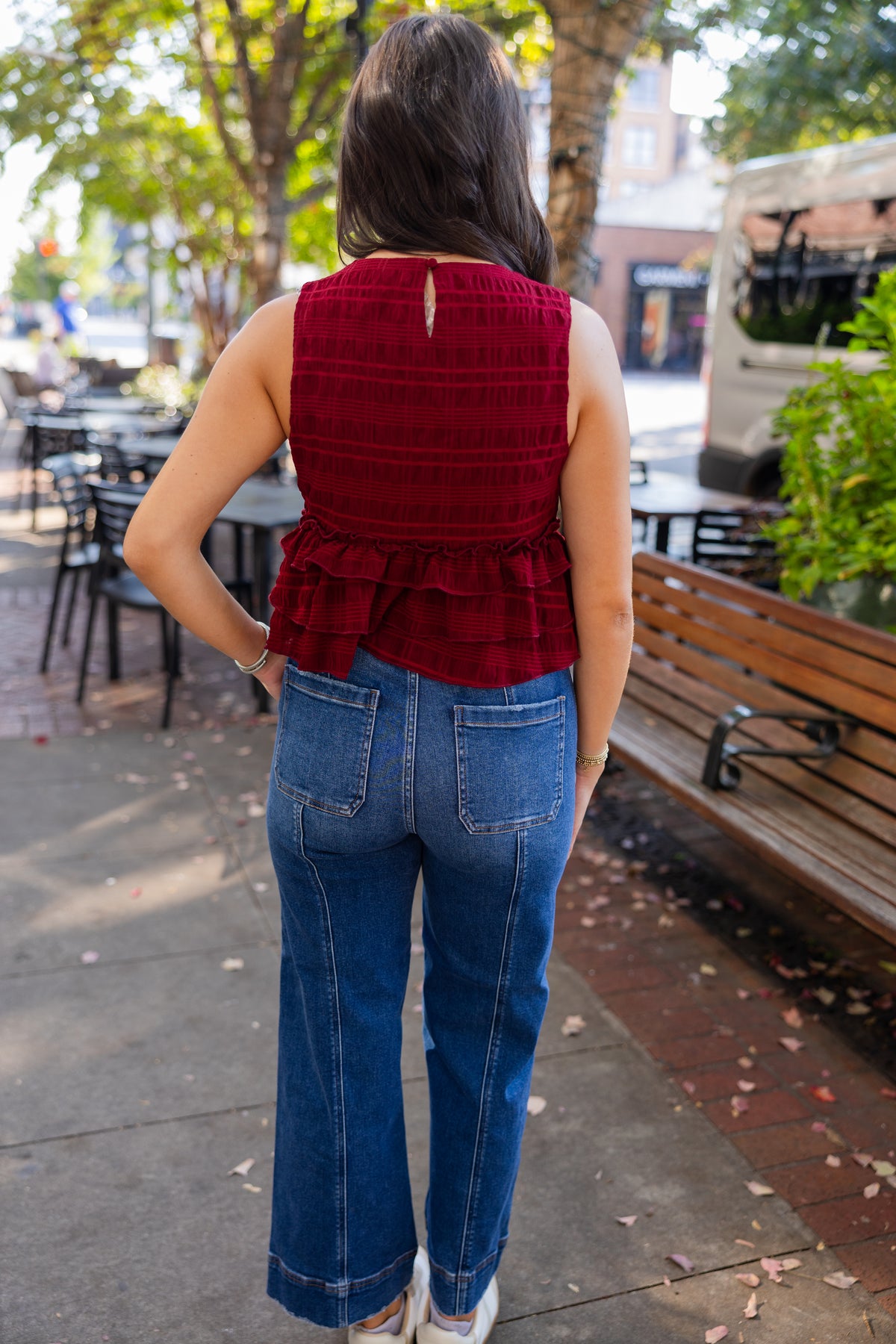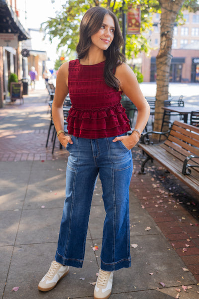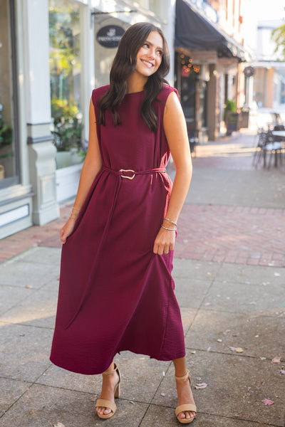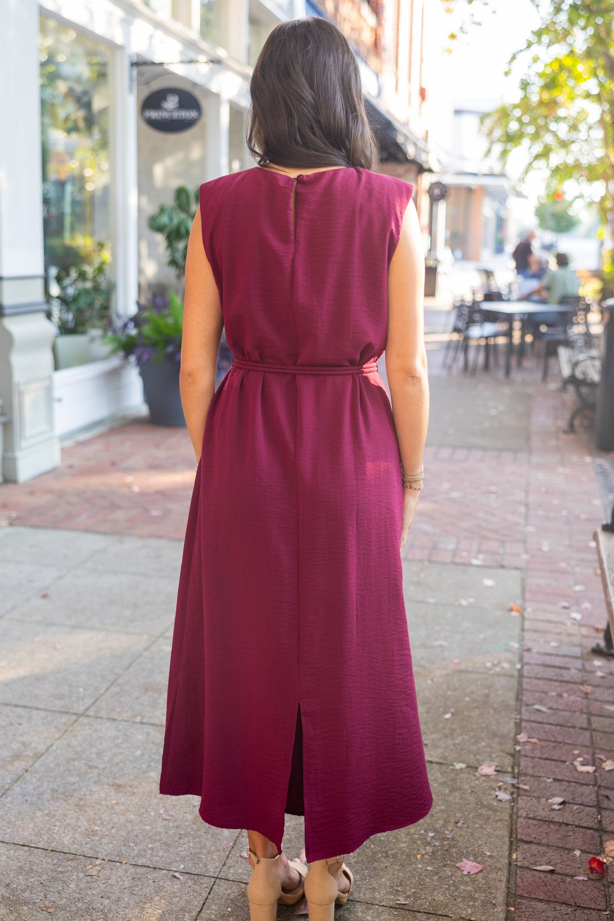 Burgundy sleeveless midi dress with a gold accent tie at the waist, back button close, lined