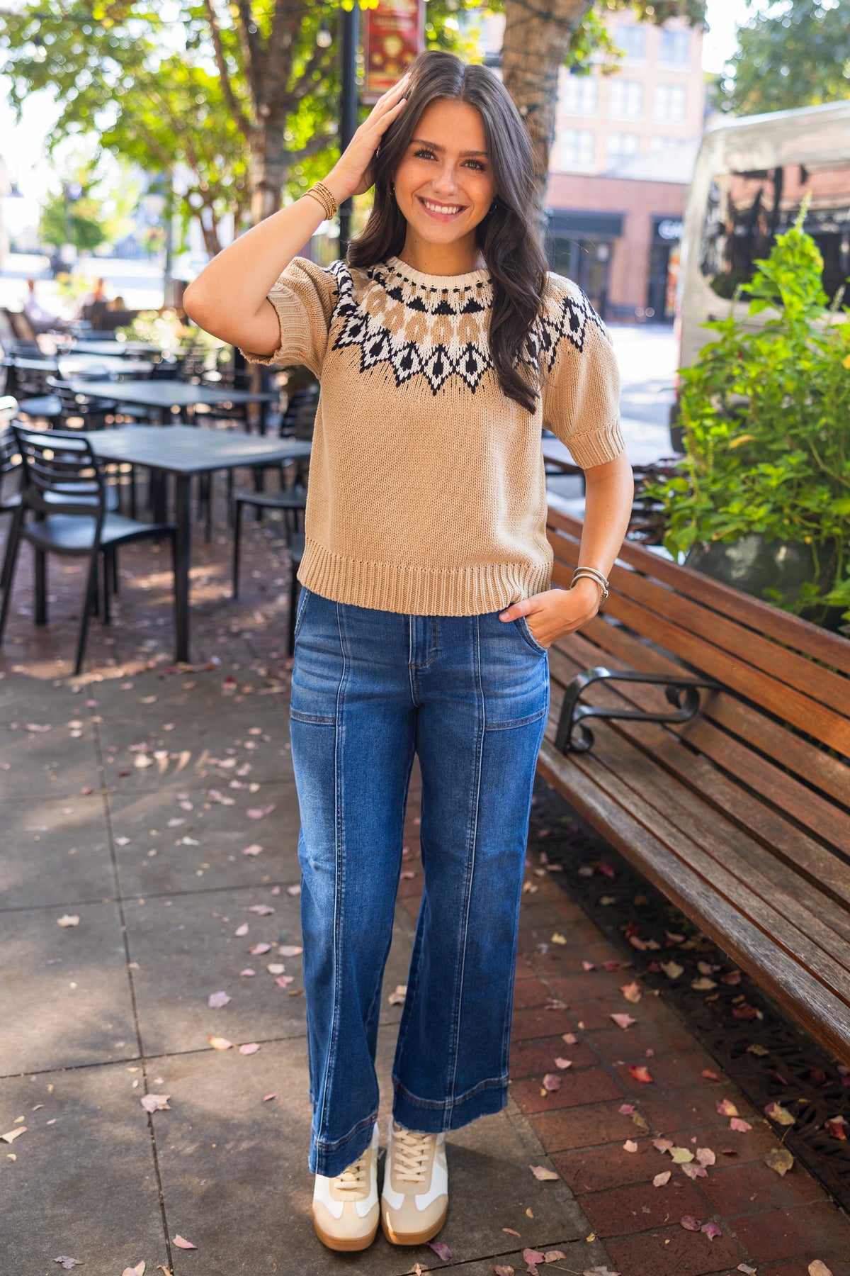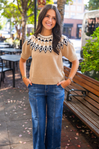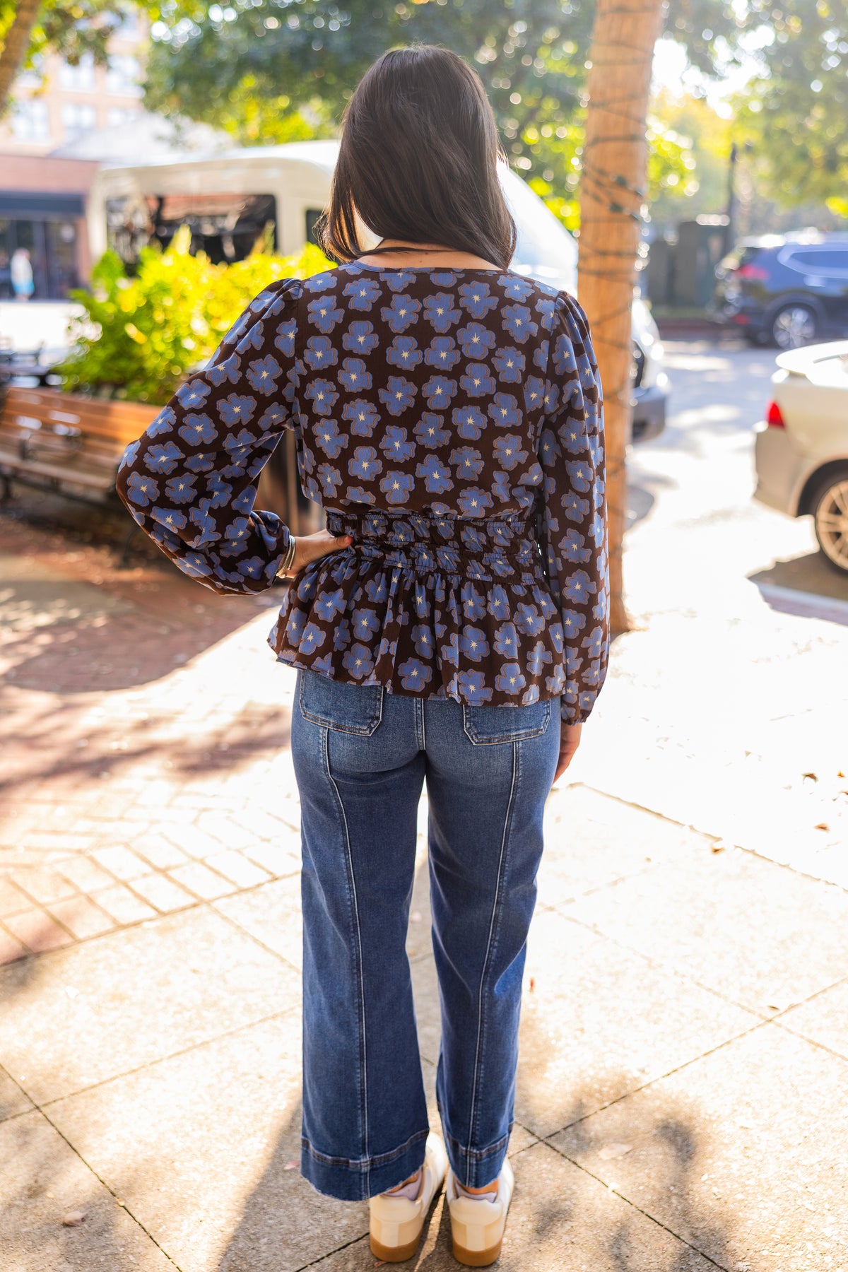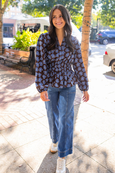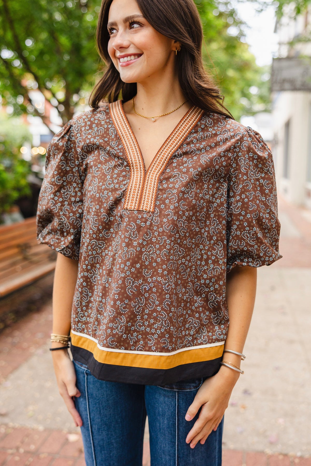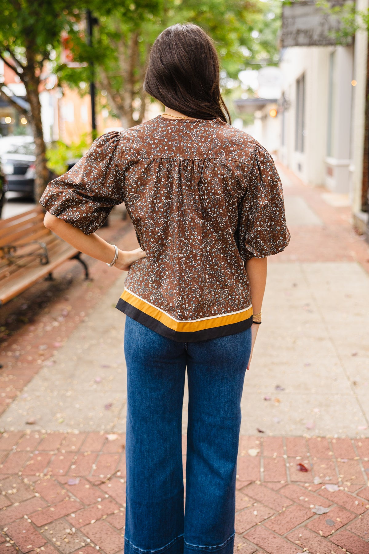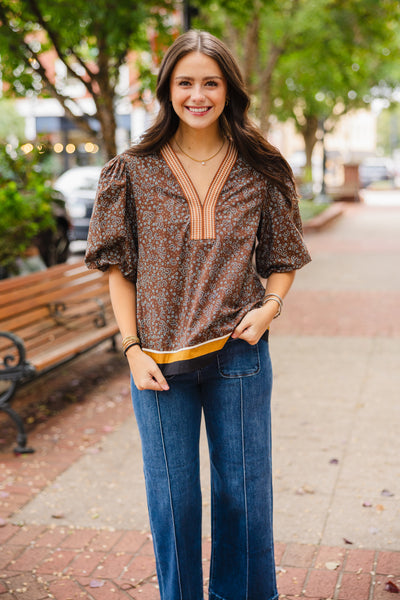 Brown print short puff sleeve blouse with a V neckline and contrast trim on the neckline and hem