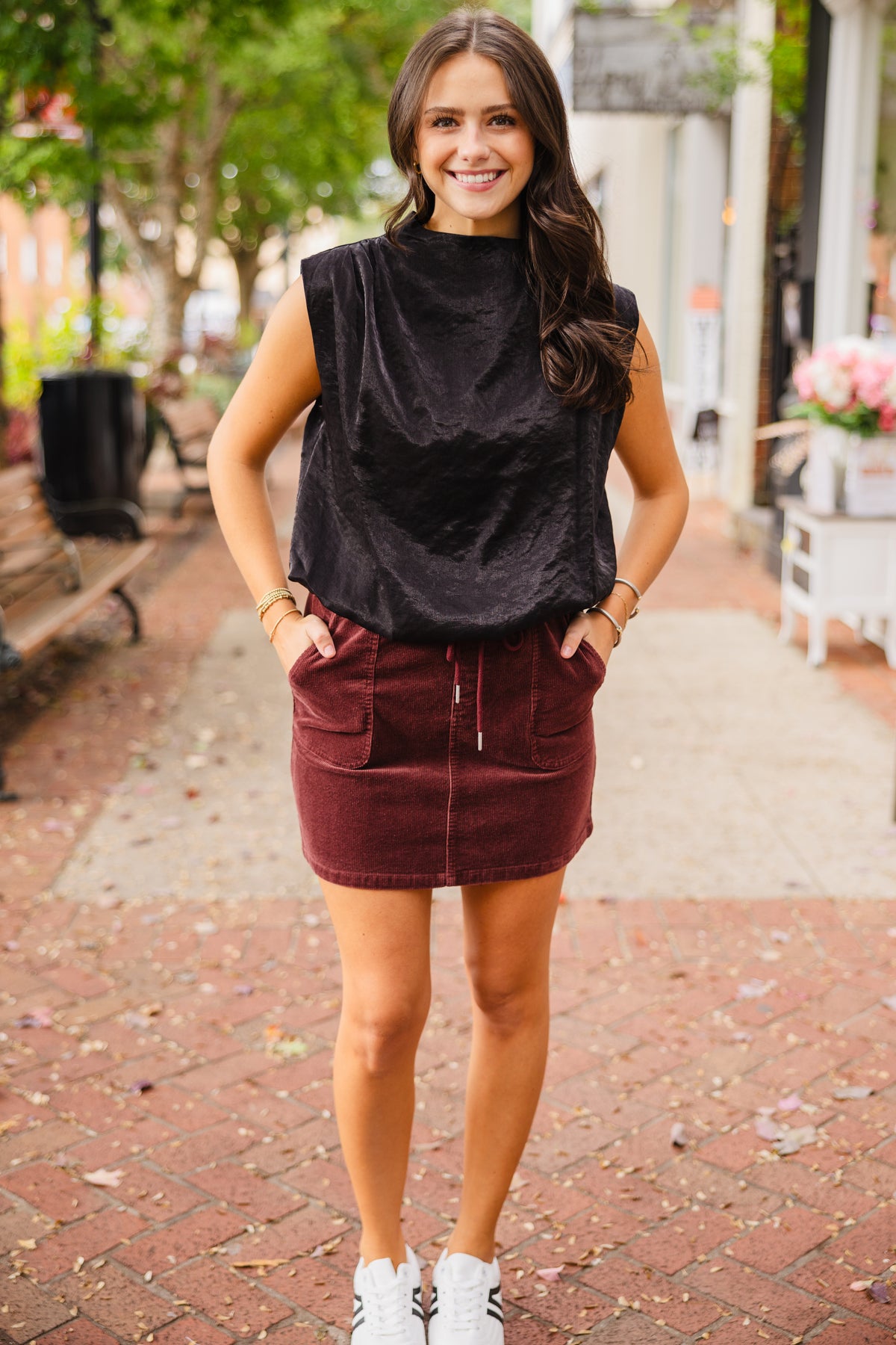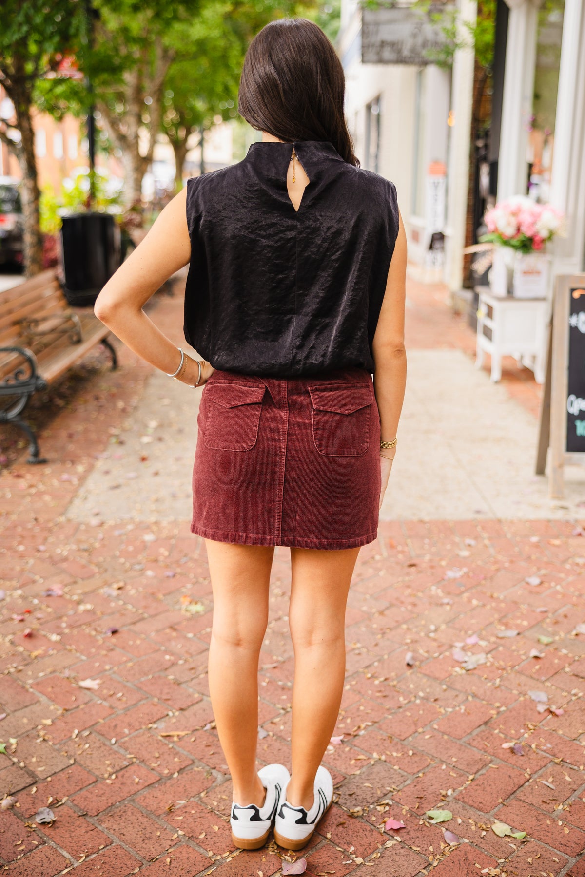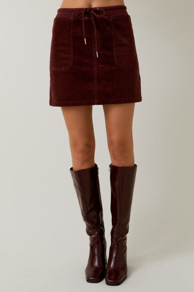 Brown corduroy mini skirt with an elastic, drawstring waistband, side and back pockets