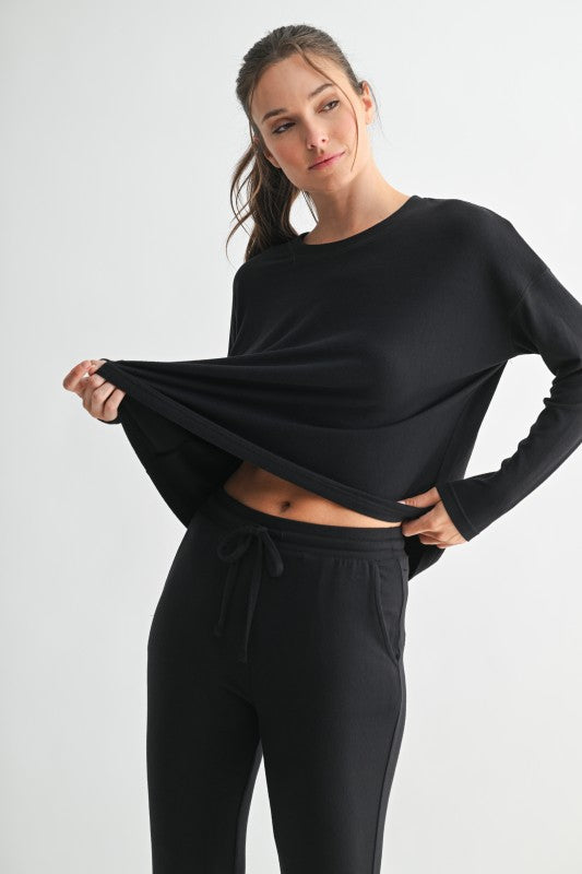 Malibu straight leg lounge pants with an elastic drawstring waistband and side raw edge patch pockets