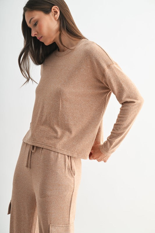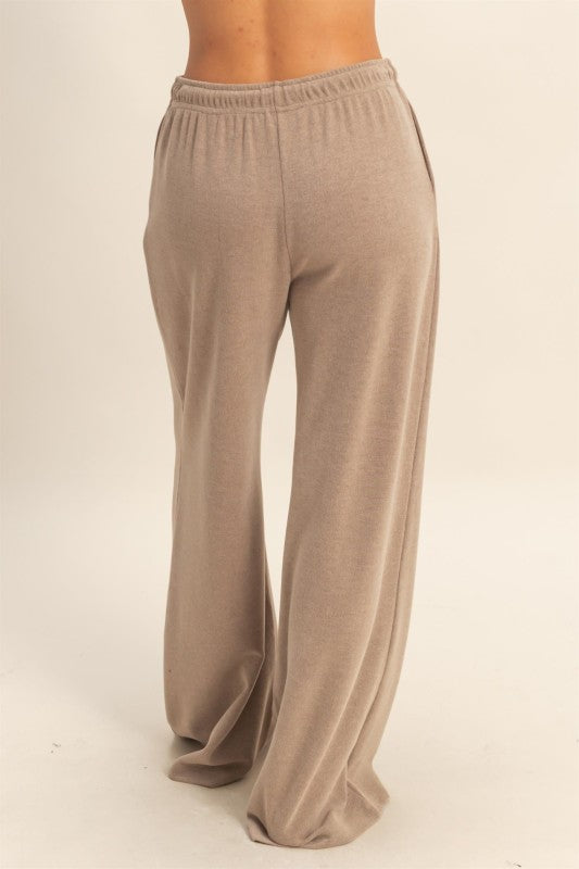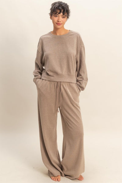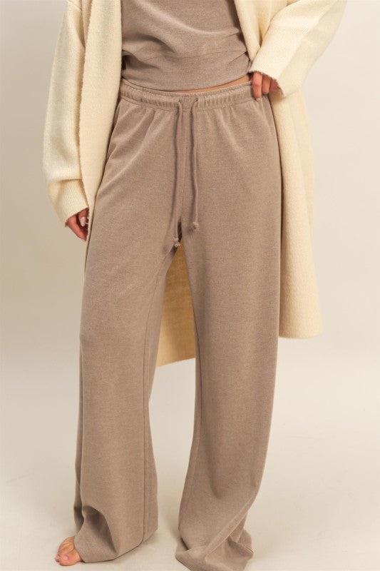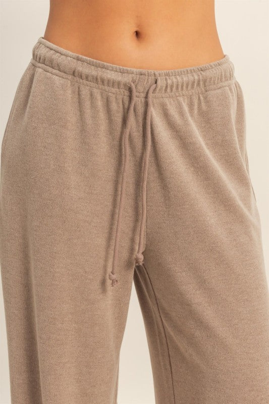 Soft ribbed wide leg drawstring waist sweatpants with side pockets in dusty mocha