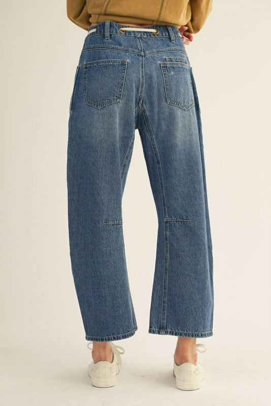 Drawstring washed denim barrel jeans, button close, front and back pockets