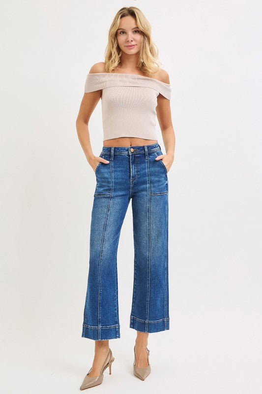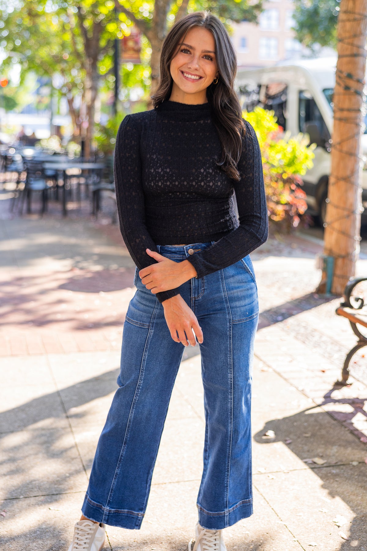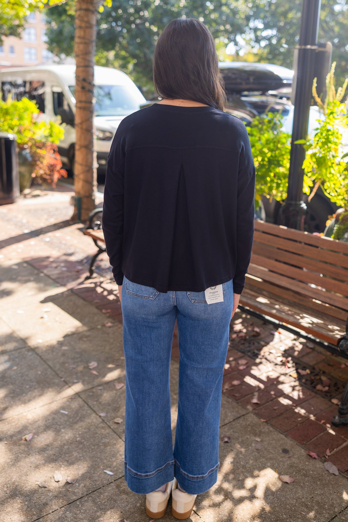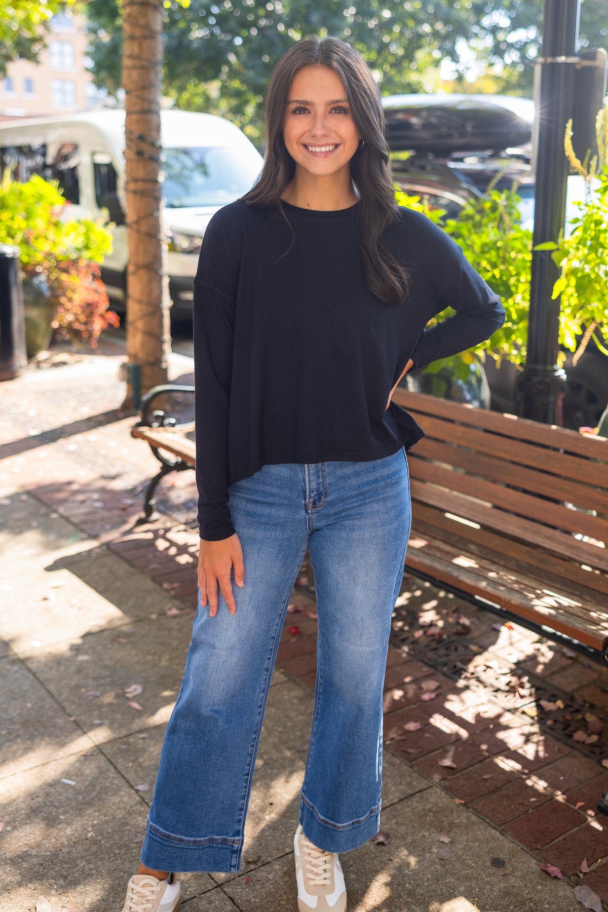 Black stretch wide leg jeans with a raw edge hem, flat front and back pockets