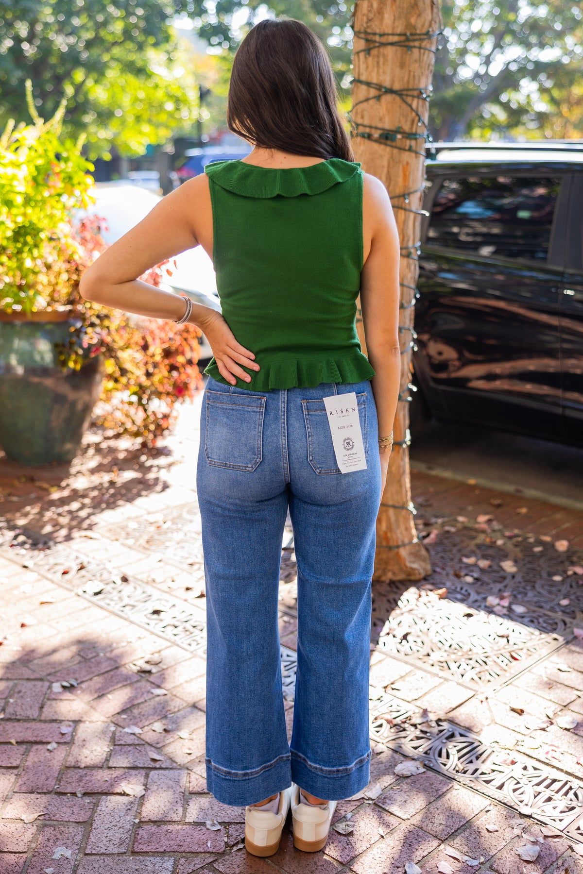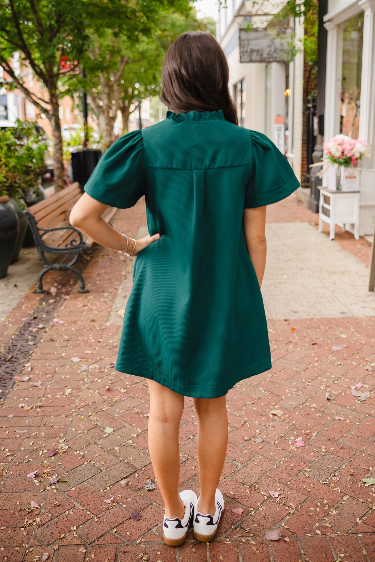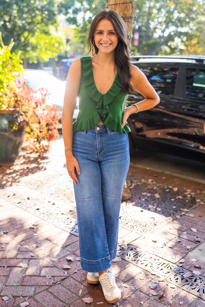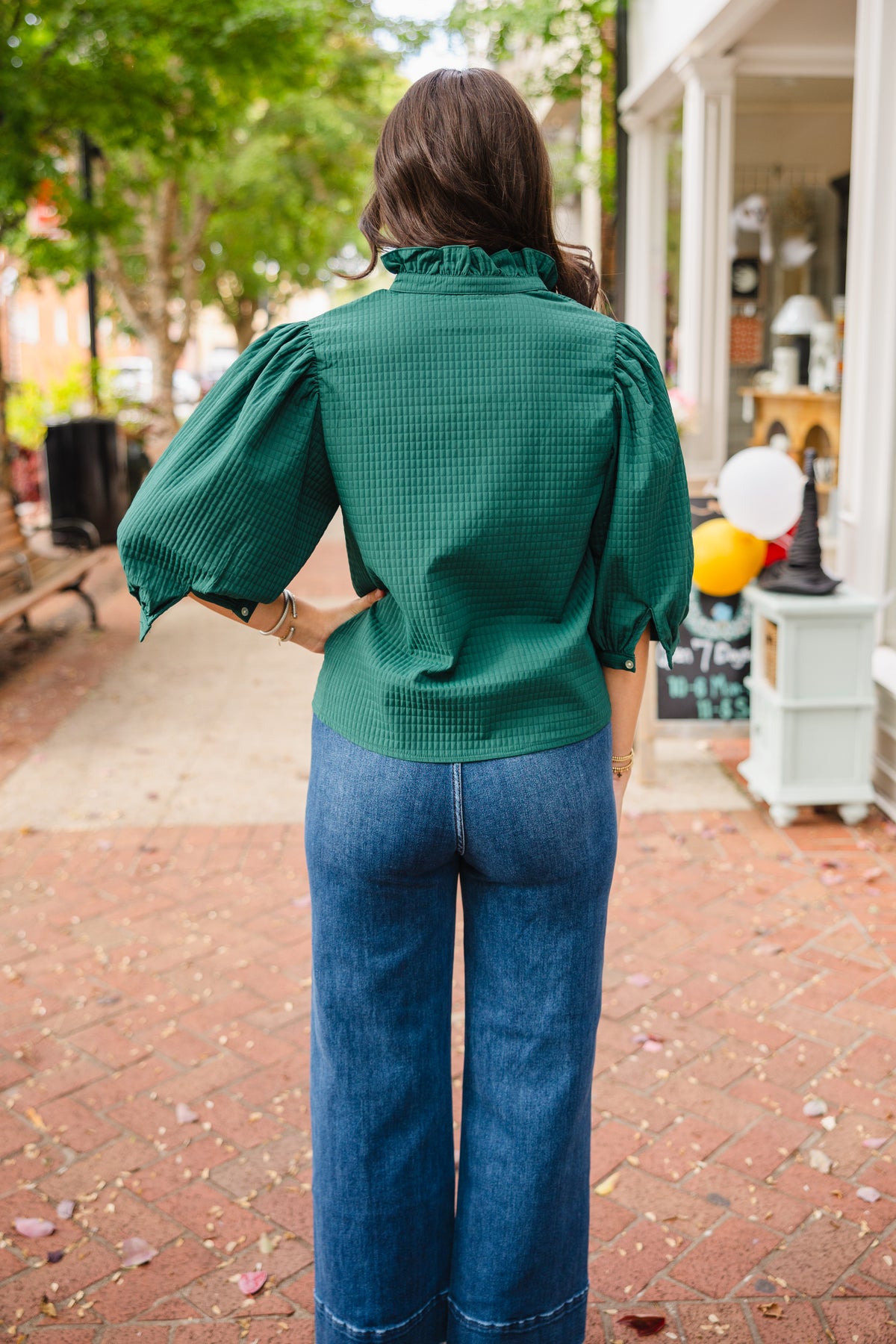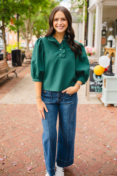 Hunter green ruffle trim textured, puff sleeve blouse with a half button down front and button close cuffs
