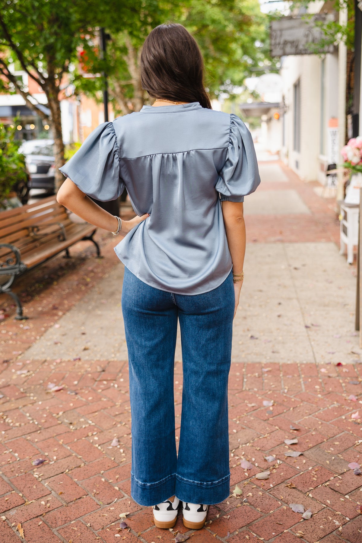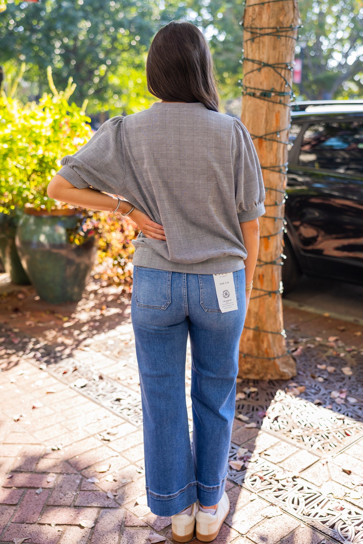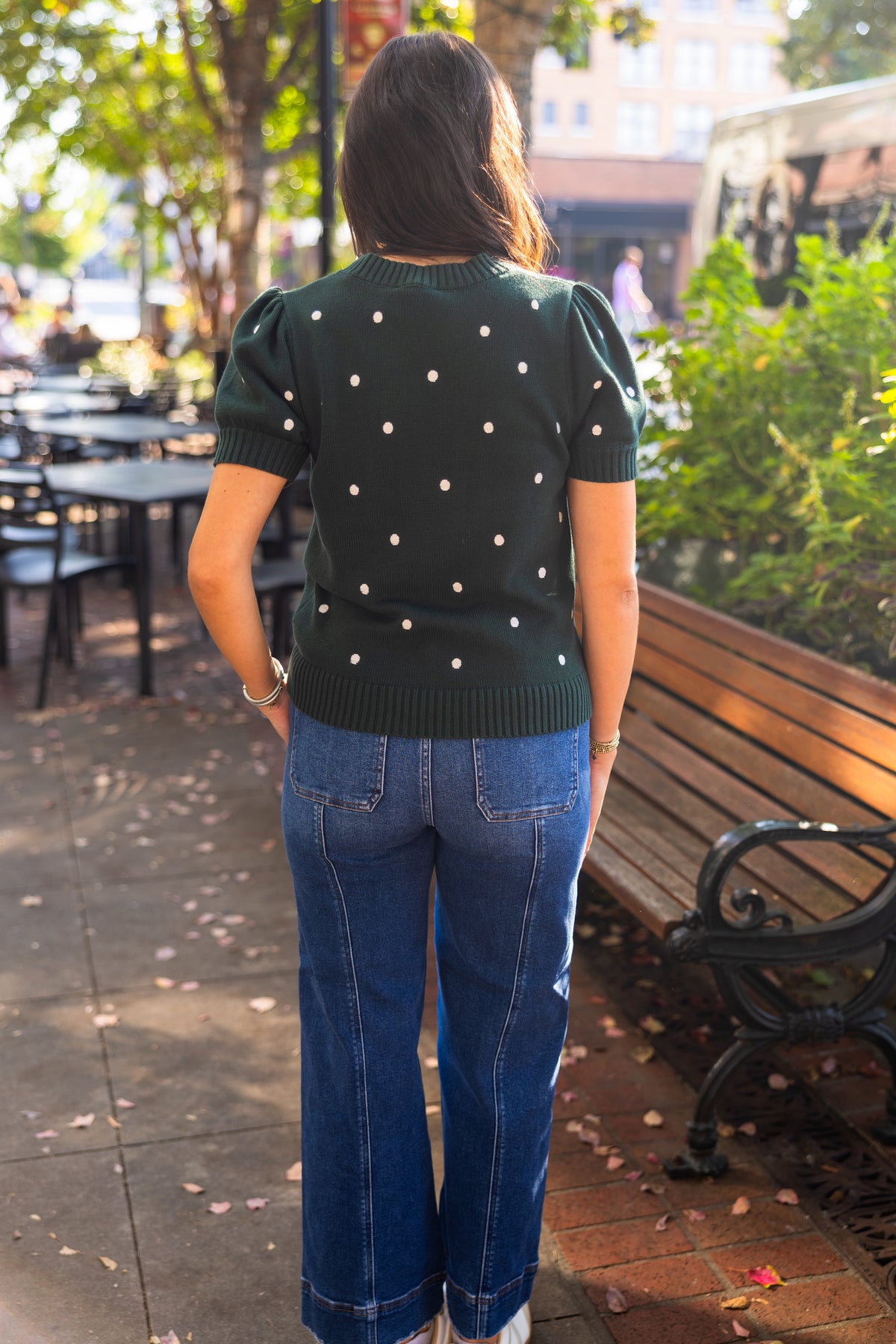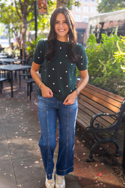 Hunter green ruffle trim textured, puff sleeve blouse with a half button down front and button close cuffs