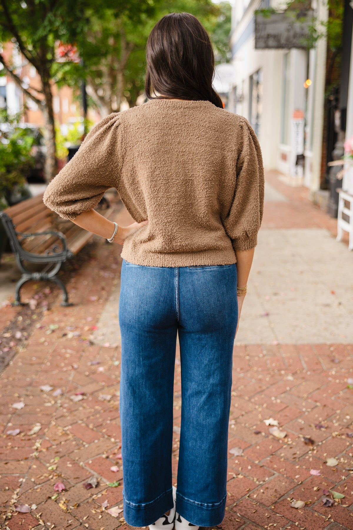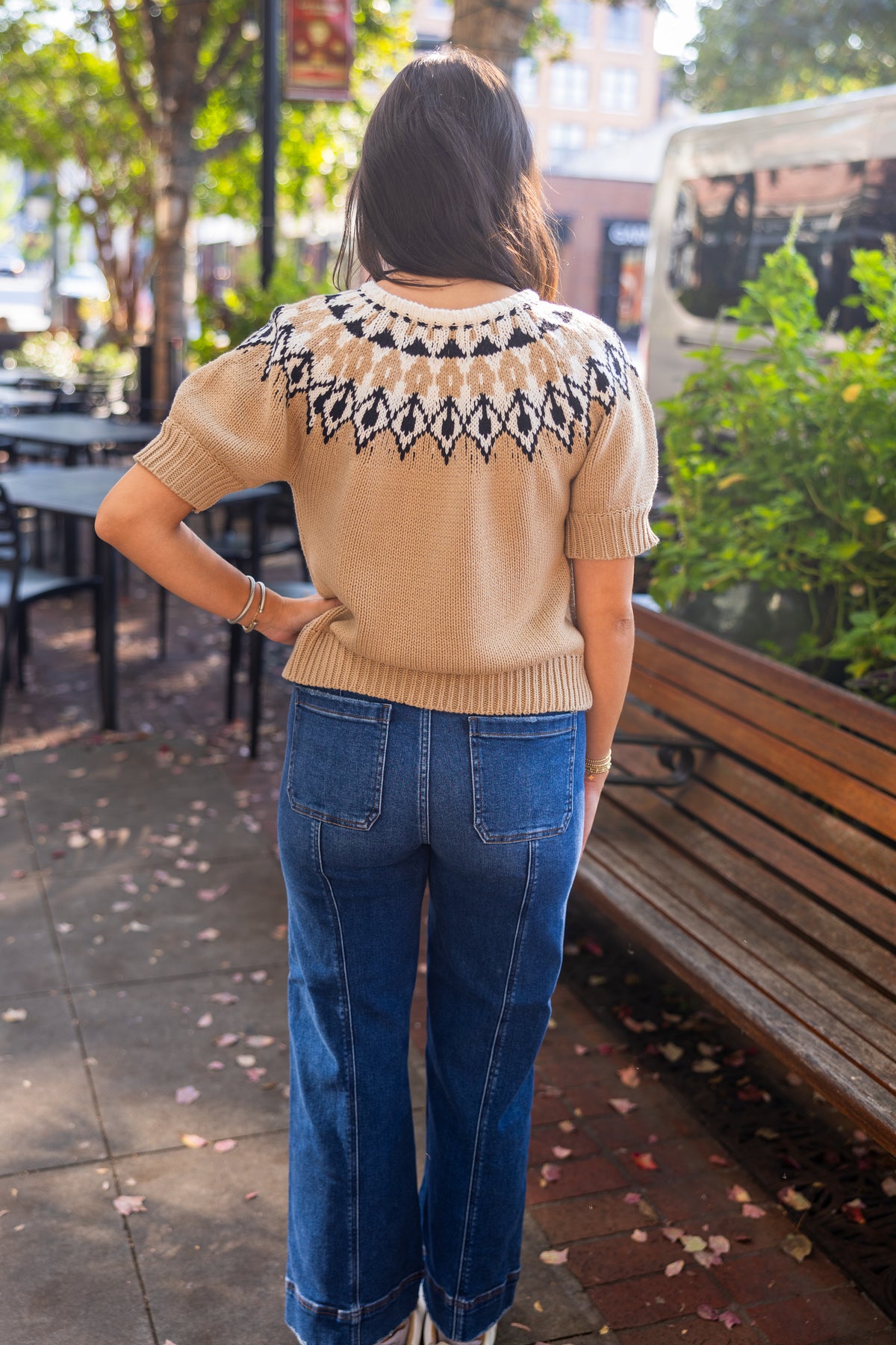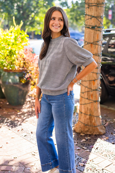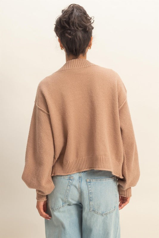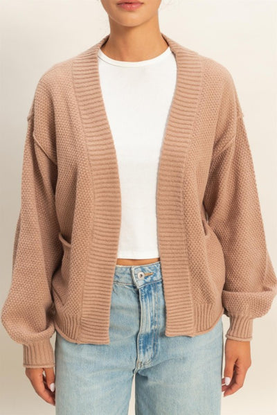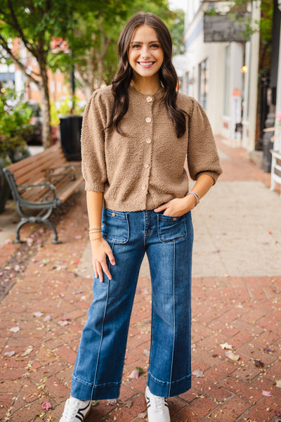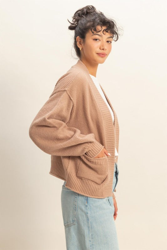 Taupe short sleeve button down cardigan with gold button detail and slight puff sleeves