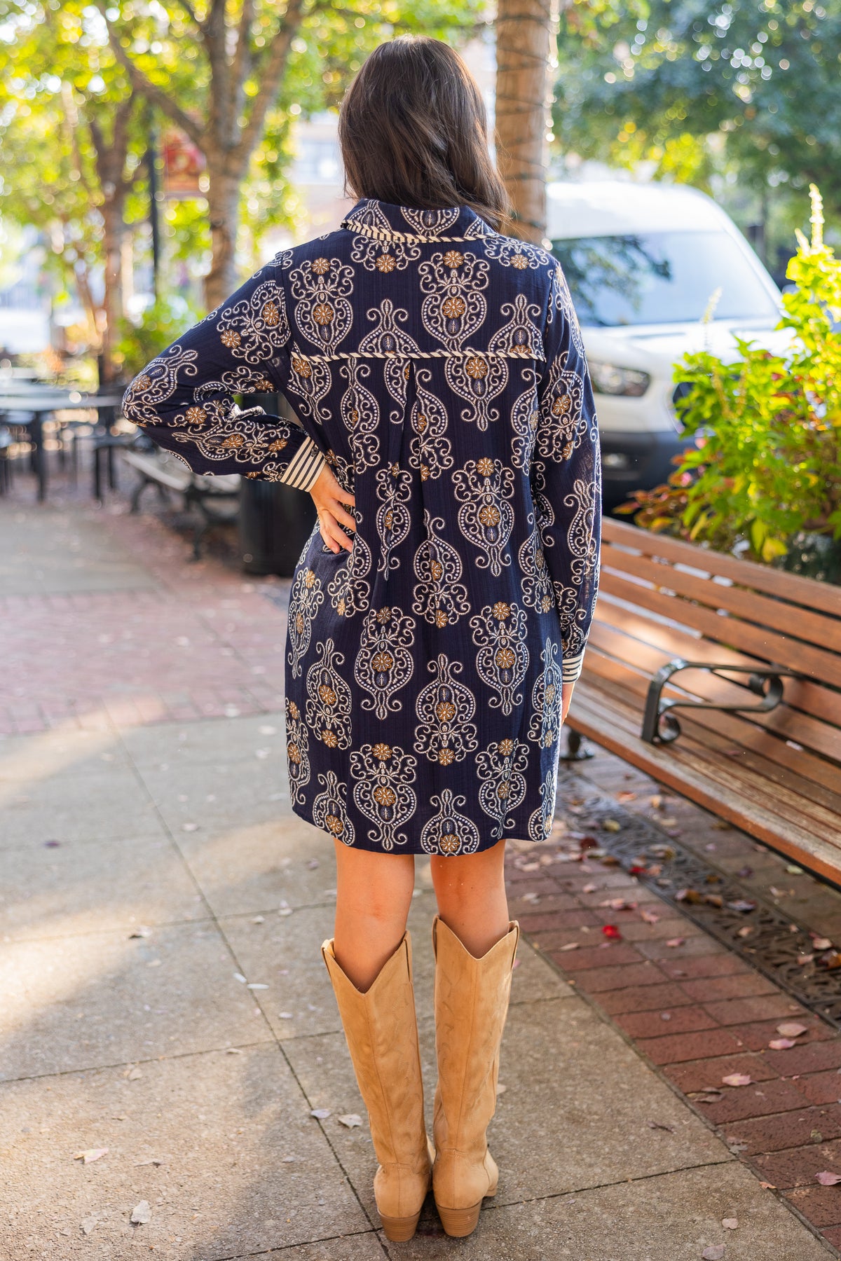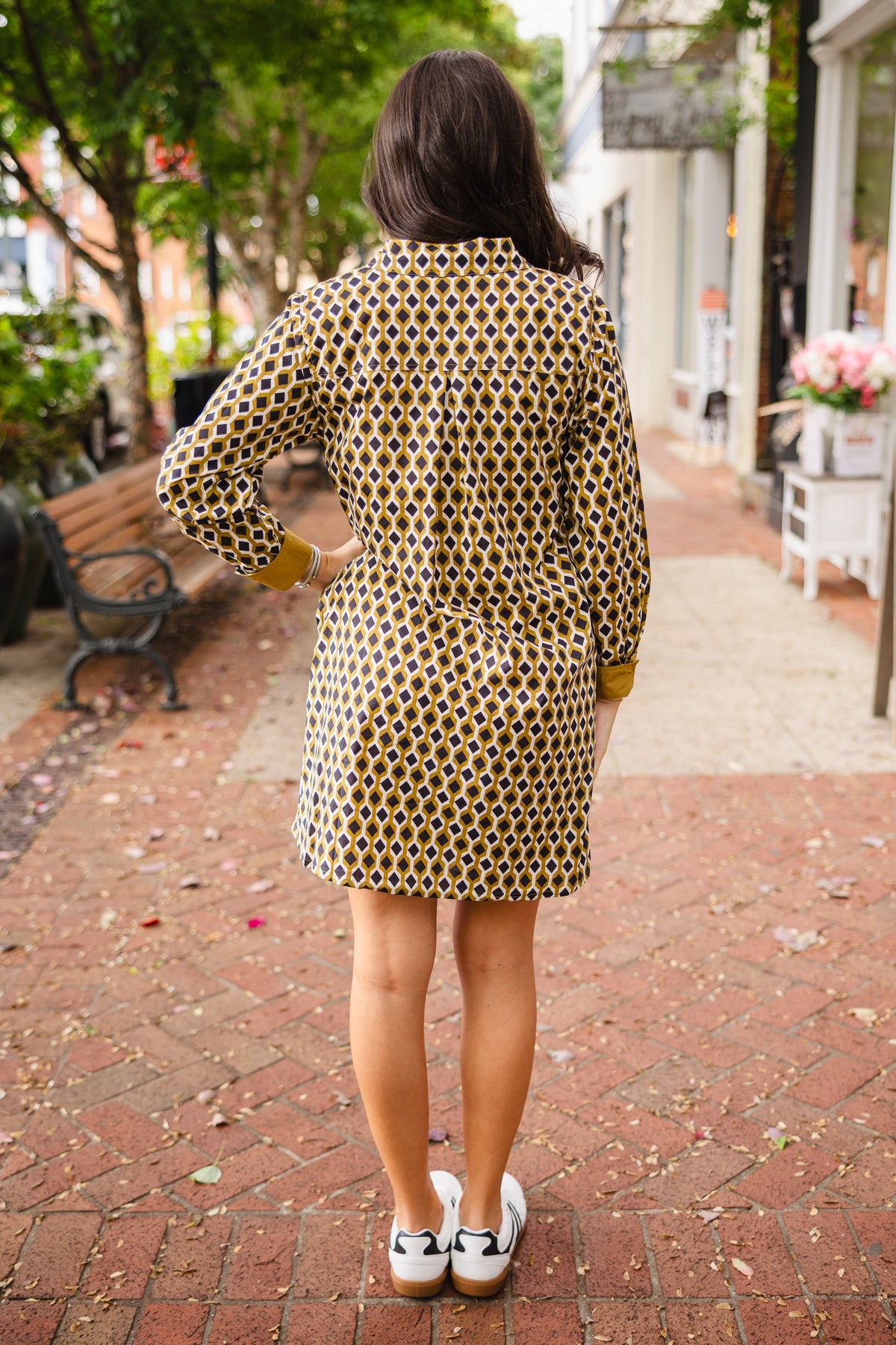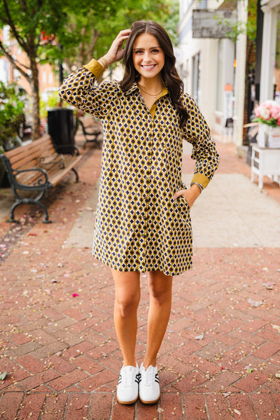 Avocado geo print long sleeve, button down shirt dress with side pockets