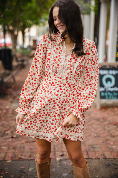 Mocha floral print button up maxi dress with a self tie waist, lined