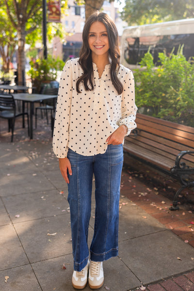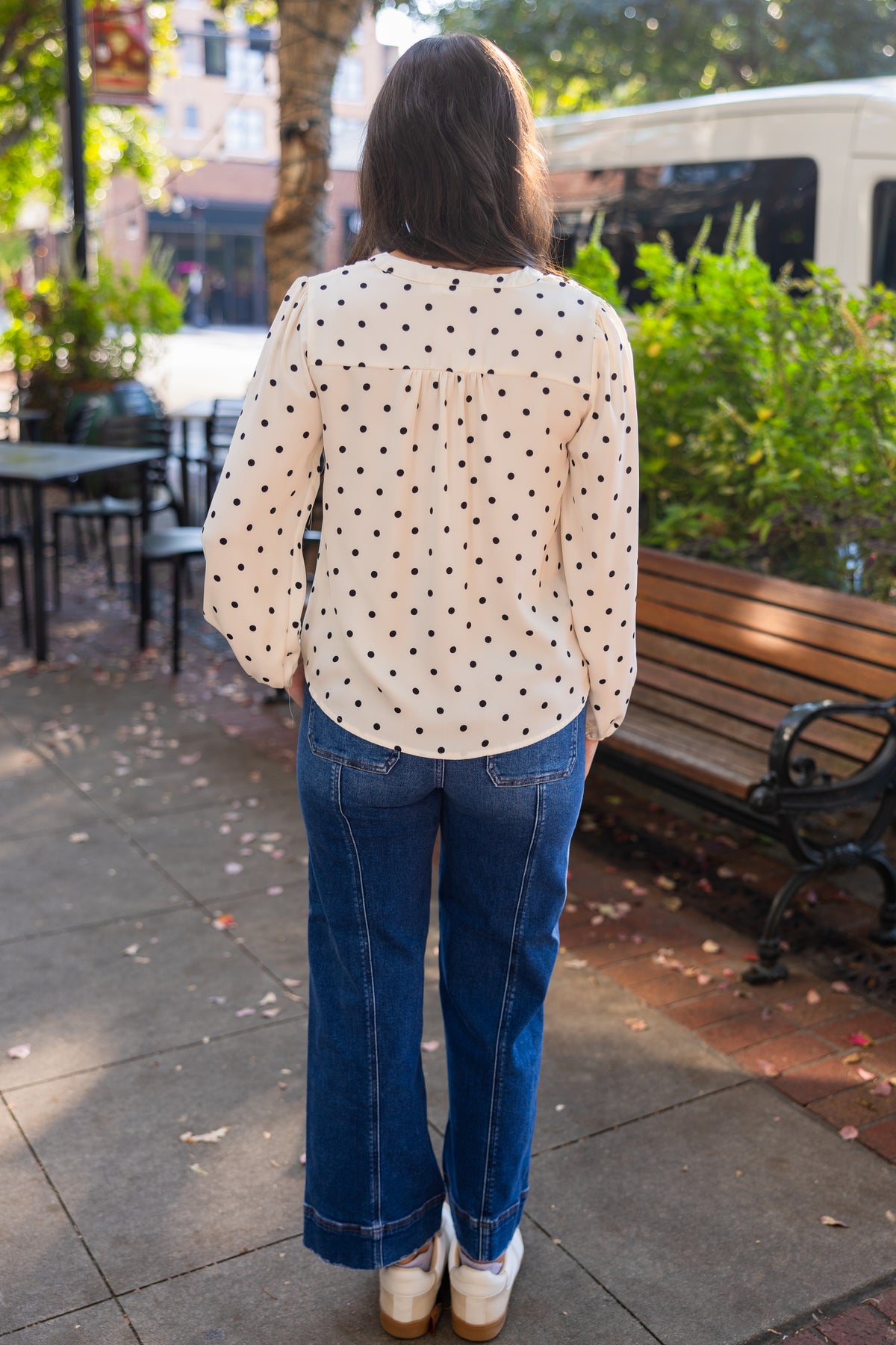 Champagne polka dot blouse, long sleeve with button front detail and back pleats