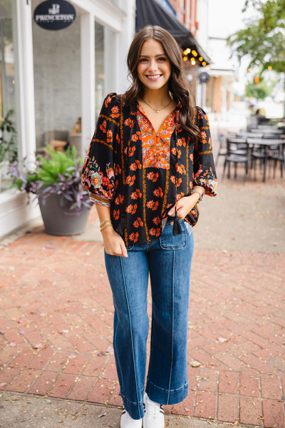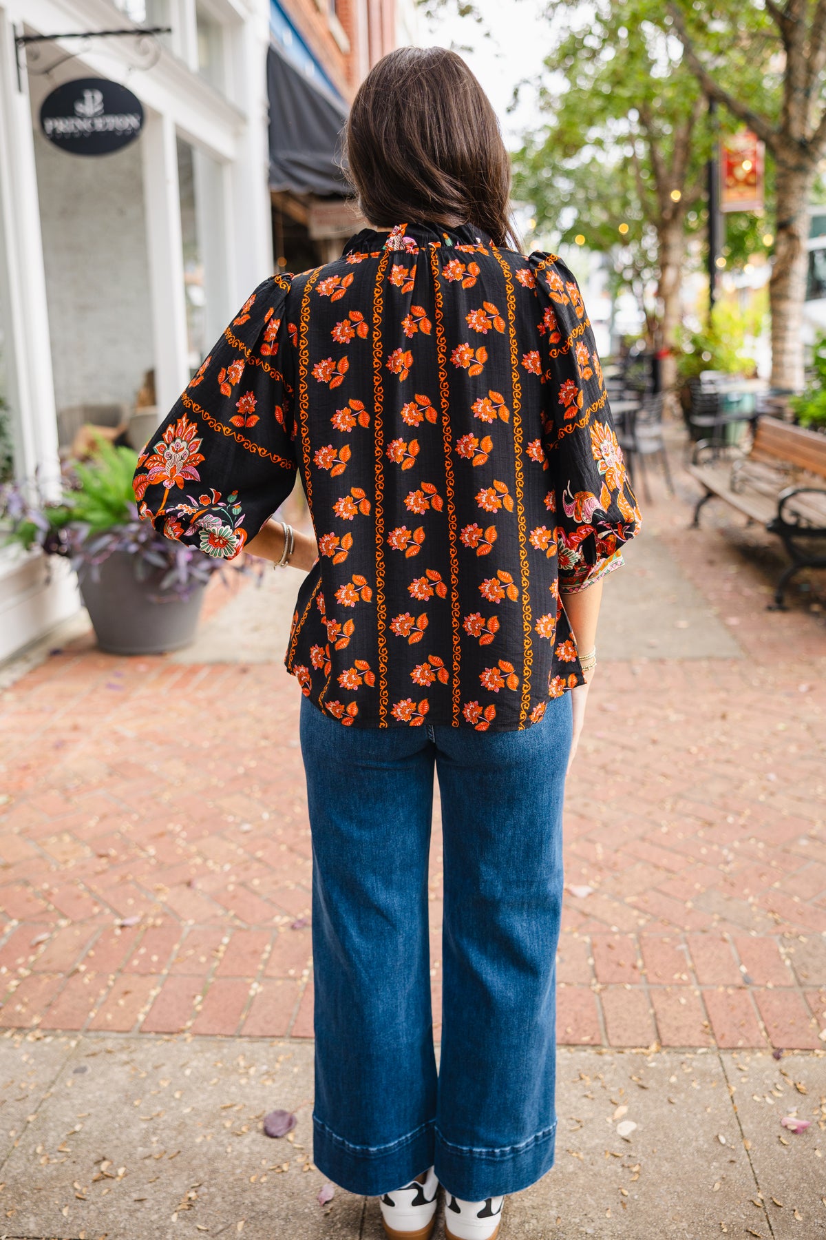 Black floral print blouse with a ruffle trim neckline, half button down with tie detail, and elbow length sleeves, button close
