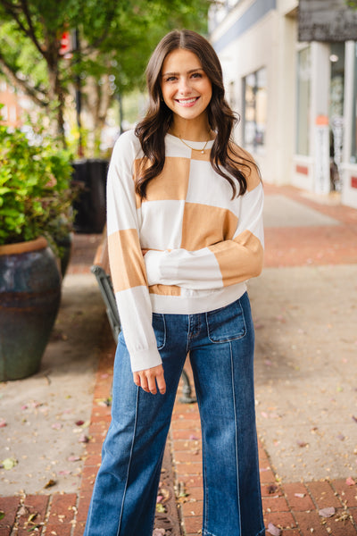 Brown and beige sleeveless color block bodysuit, snap close bottom