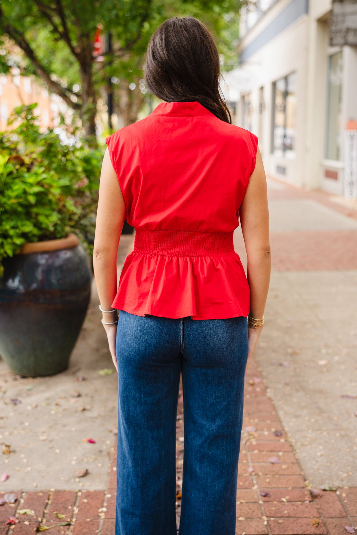 Red ruffle neck sleeveless dress with tie detail, side pockets