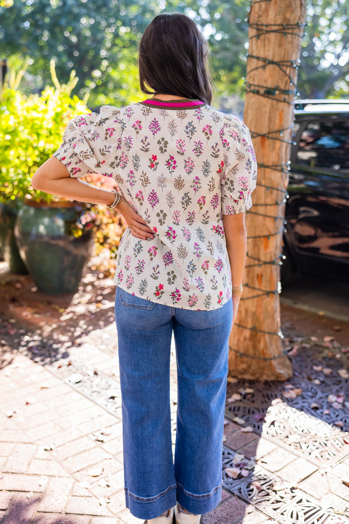 Cream floral print puff sleeve blouse with a multicolor V neckline