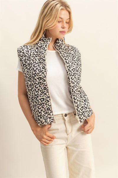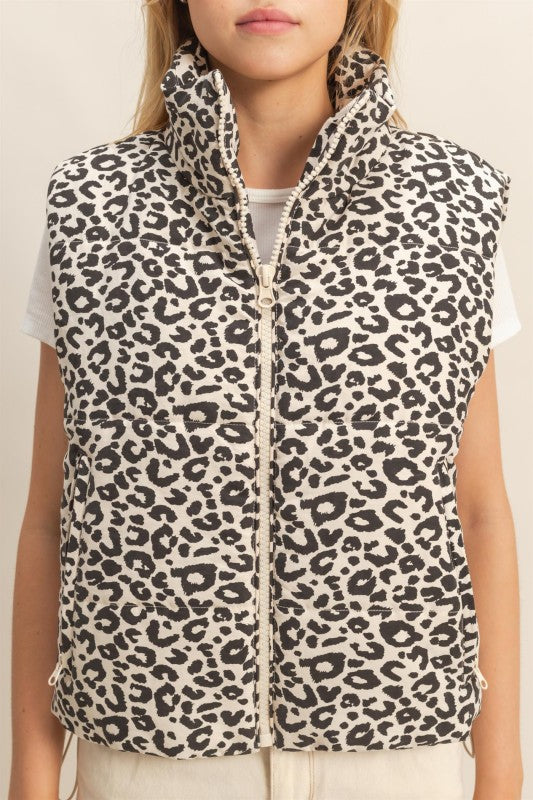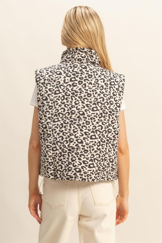 Khaki leopard print quilted puffer jacket with snap close and side pockets