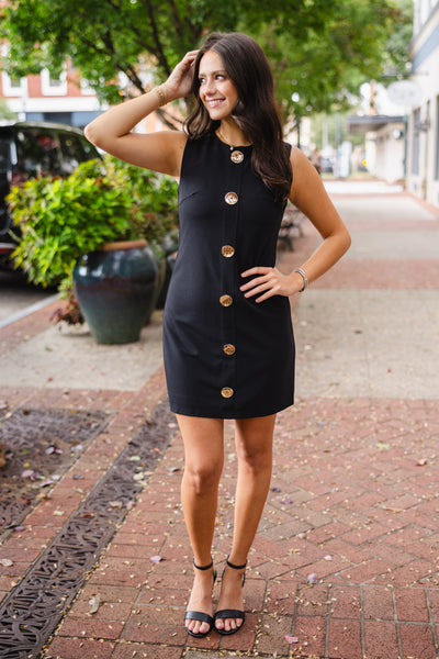 Black front zipper sleeveless dress with an elastic waistband and side pockets