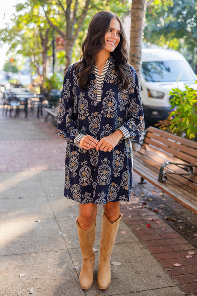 Navy boho floral print midi dress with 3/4 sleeves and lace trim detail down the front