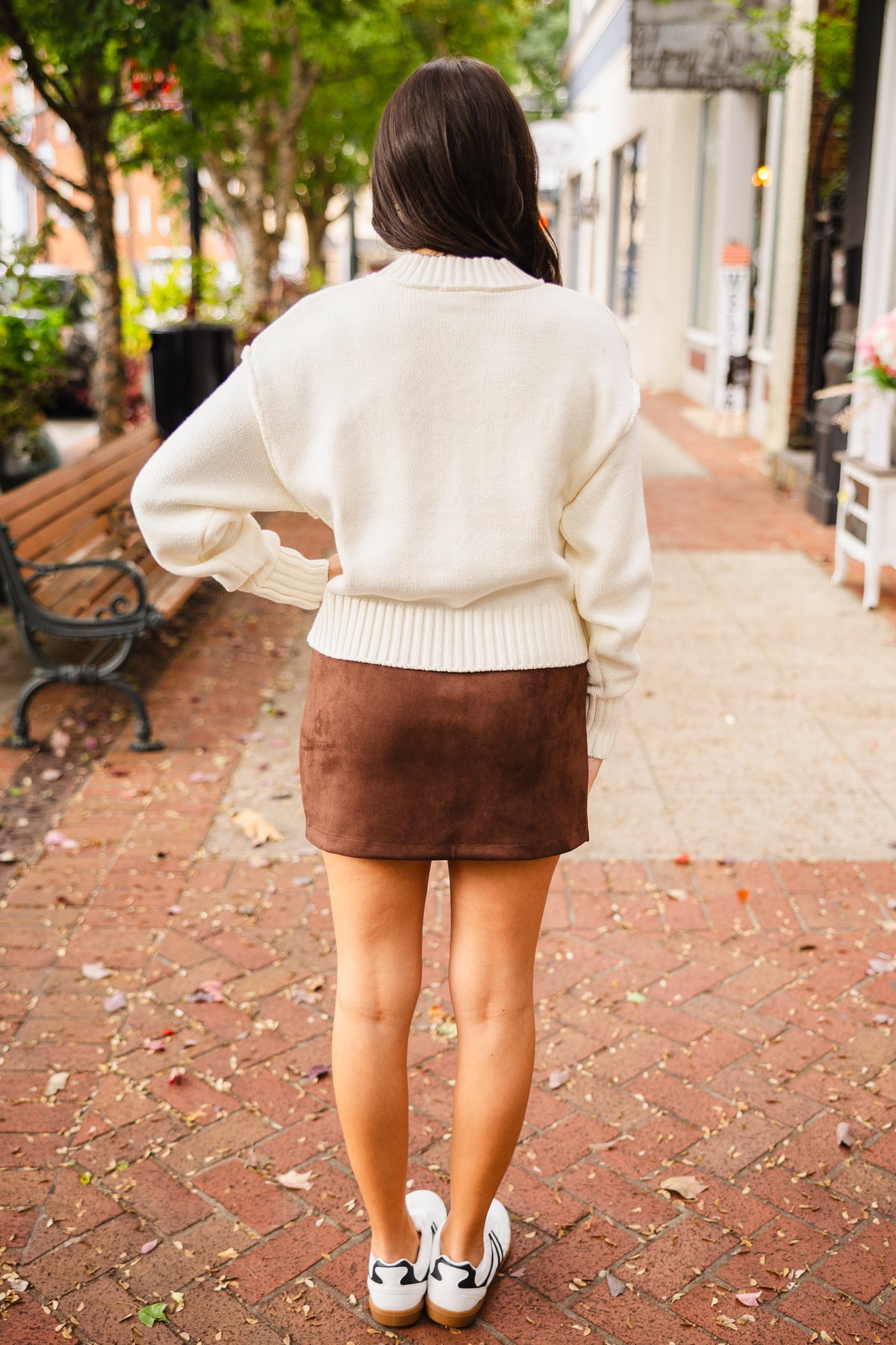 Chocolate brown suede mini skirt with zip close and pocket slits
