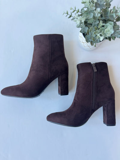 Mocha faux suede pull on bootie with side elastic detail and inside zip close