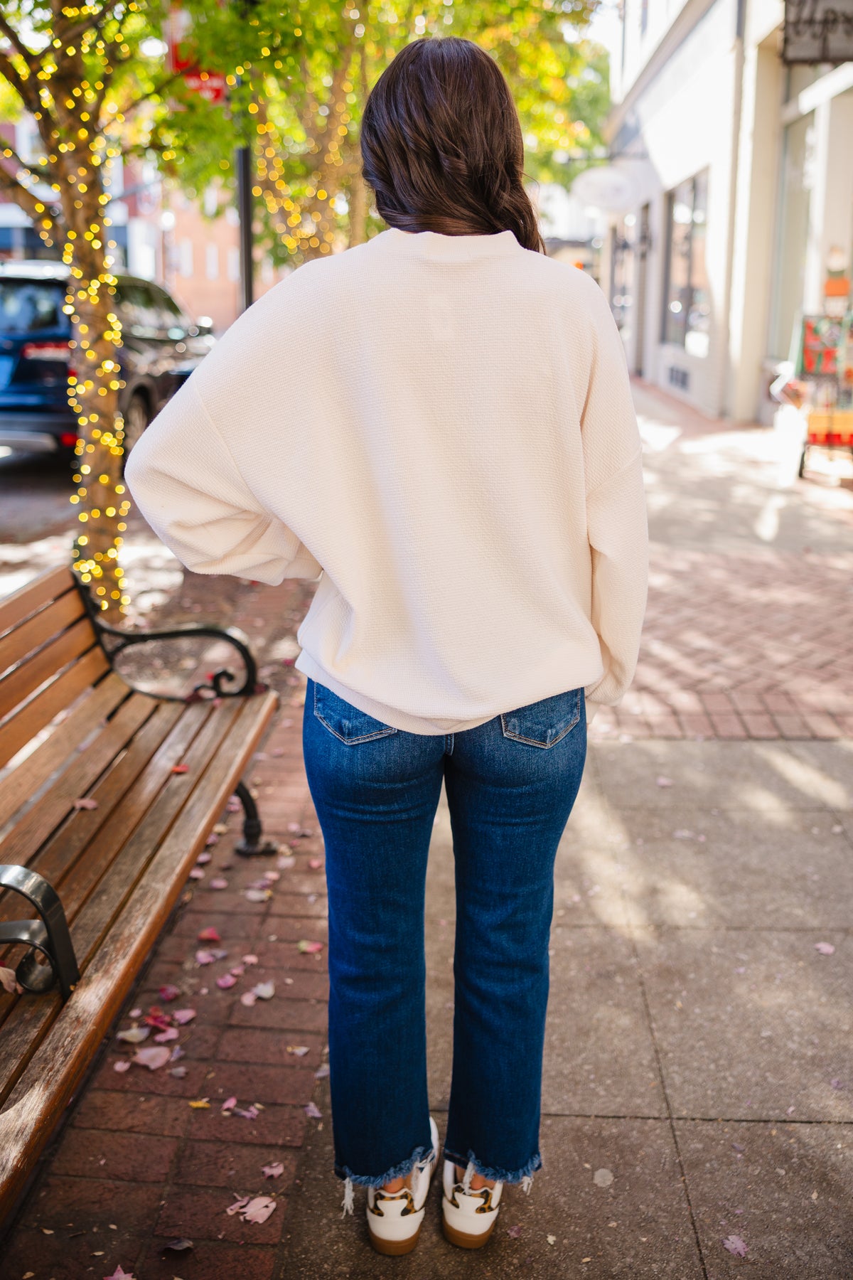 Long sleeve striped pullover with a banded bottom and seam detail on the shoulders