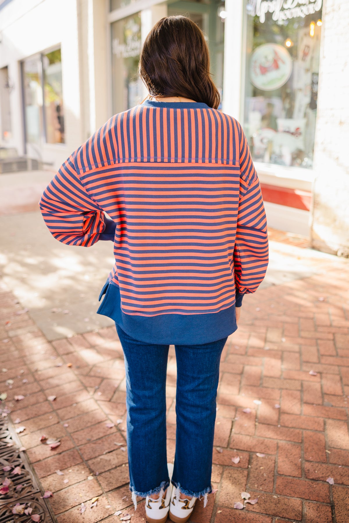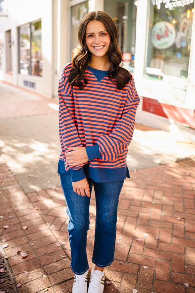 Striped comfy oversized pullover with reverse stitch detail and contrast detail on the band, cuffs and neckline